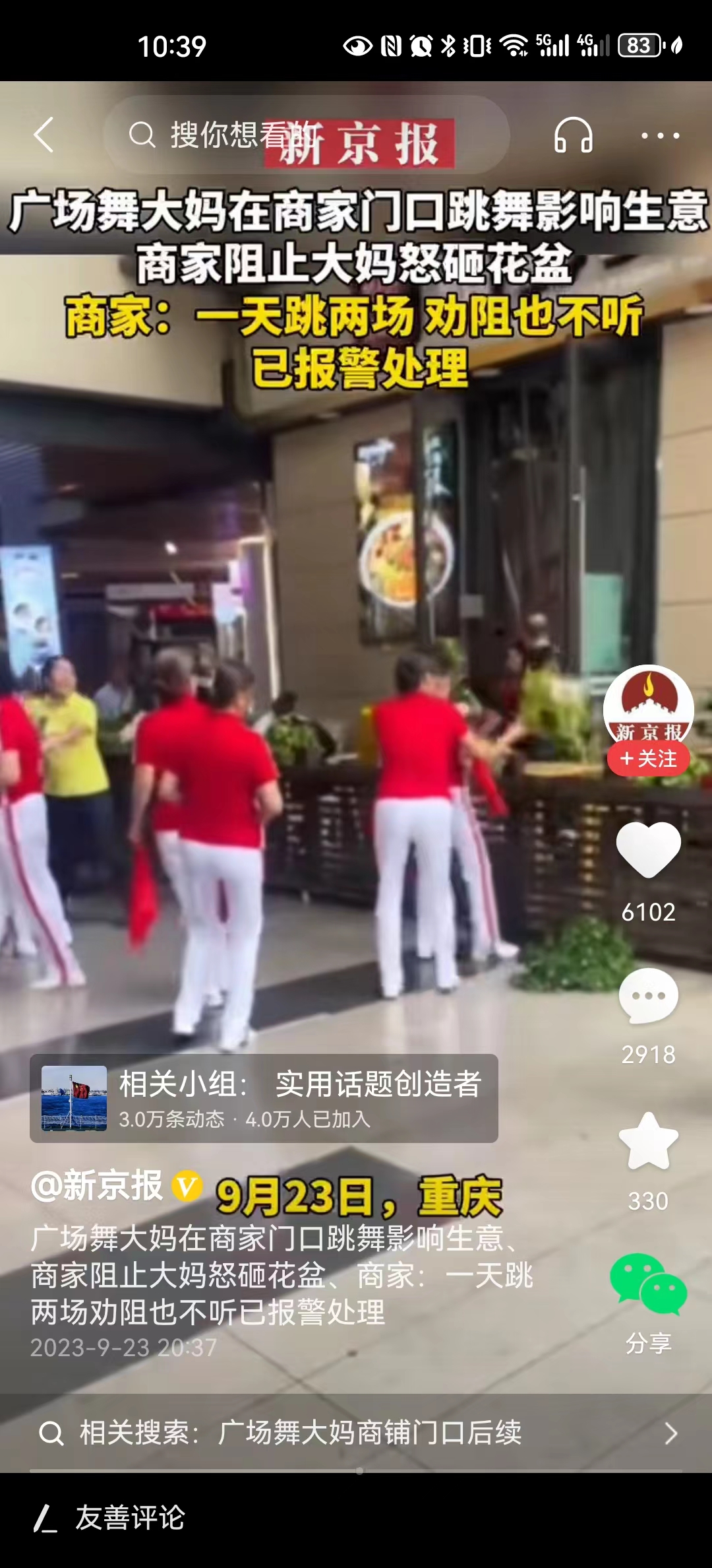 在重庆一个商场门口,有着一家冒菜店,人家要做生意,要赚钱,要养活员工。但是广场舞大妈看上了门口的空地,一天跳两场,风雨无阻。商家阻挠,就被这些大妈一起围攻,又是吵、又是闹,又是扔花盆,最后商家无奈只能报警。