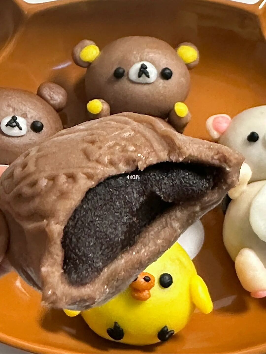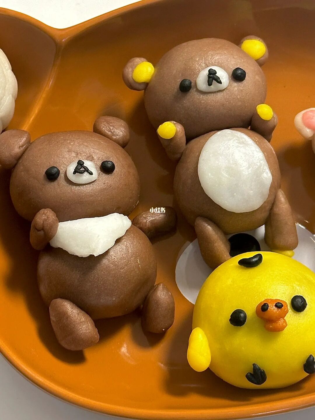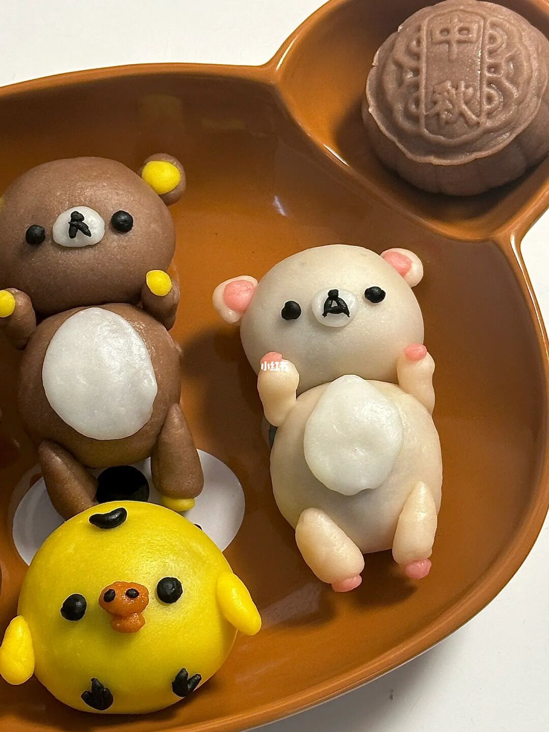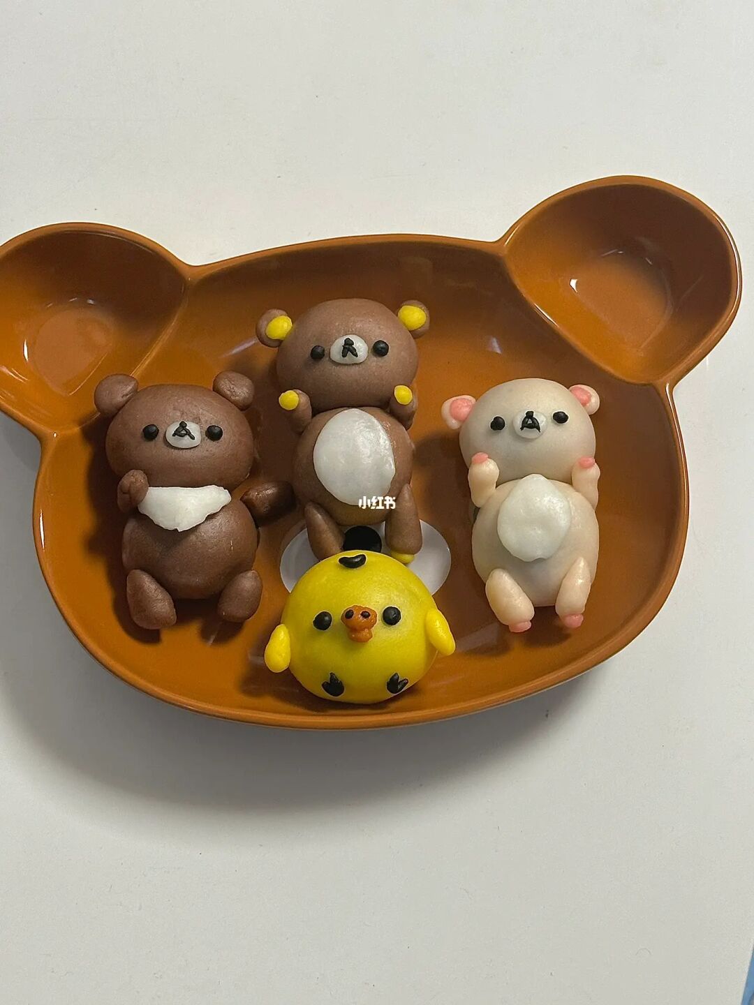 2.小熊的头部是20g皮包入20g馅,身体是16g皮包入16g馅,其他细节都是用皮装饰的没有包馅啦,然后小鸡是30g皮包入30g馅