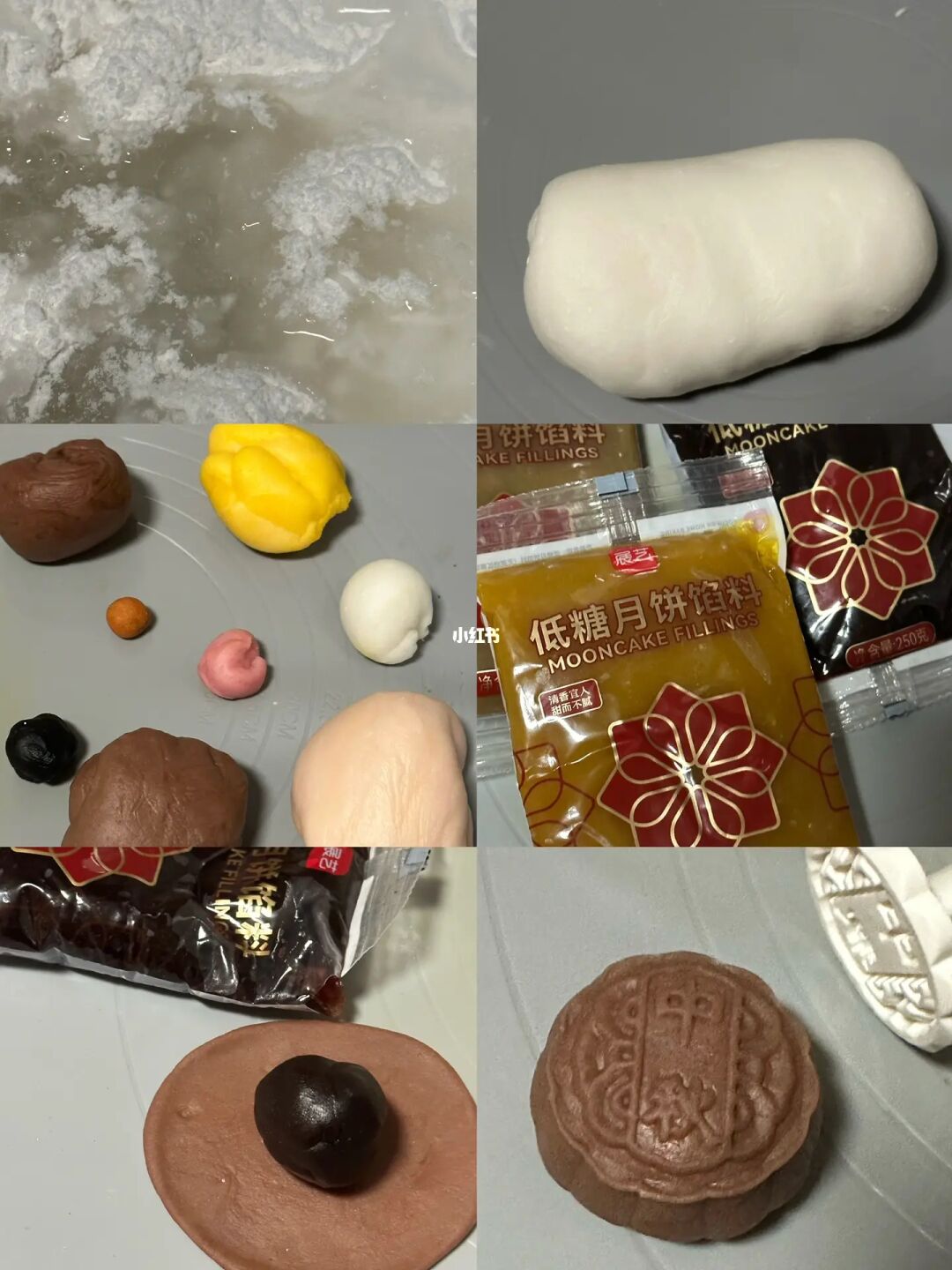 1.190g冰皮月饼预拌粉加160g开水揉成团(这里最好戴个一次性手套防粘),再分份调色