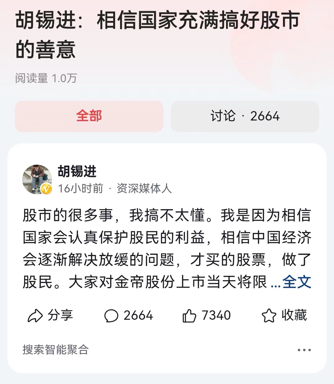 #胡锡进:相信国家充满搞好股市的善意#老胡是个好人,他带着资金善意的进入了股市,他的目的也不是赚钱,而是希望看到我们的资本市场越来越好。在老胡不断赔钱的过程中,他也不断修正着自己的认知。现在也同大多数股民一样,相信国家是充满着搞好股市的善意。 老胡的这个总结相信也是所有股民的总结,如果连这个认识都没有,那大家进入股市,那不就是无异于与虎谋皮吗?但是只有善意能够吗?老胡就是以金帝股份为例,自己踏踏实实的受了一次投资者教育。表面上看金帝股份好像没有违反法规,但是它利用法律法规的漏洞,成功的割了一把股民的韭菜。老胡也有一些愤怒了,他斥责这个转融通,被人利用。这个善意被人利用。#股市闲聊不较真# 股市不相信眼泪,就如同股民只相信自己账面的数字变化一样。3100点在22日保住了,但是后续还能继续保住吗?老胡亏损了之后,能够有股票扭亏为盈的那一天吗?