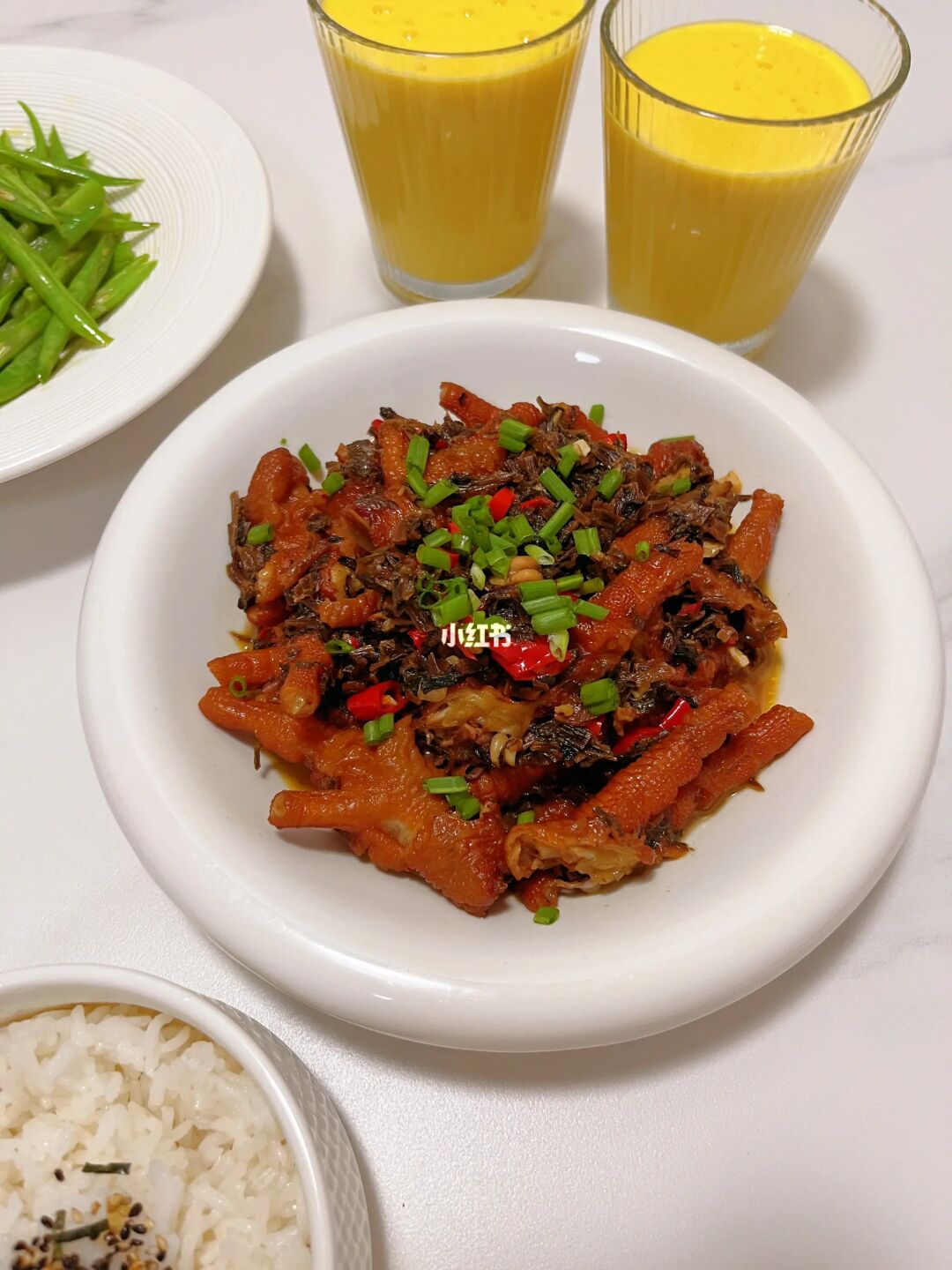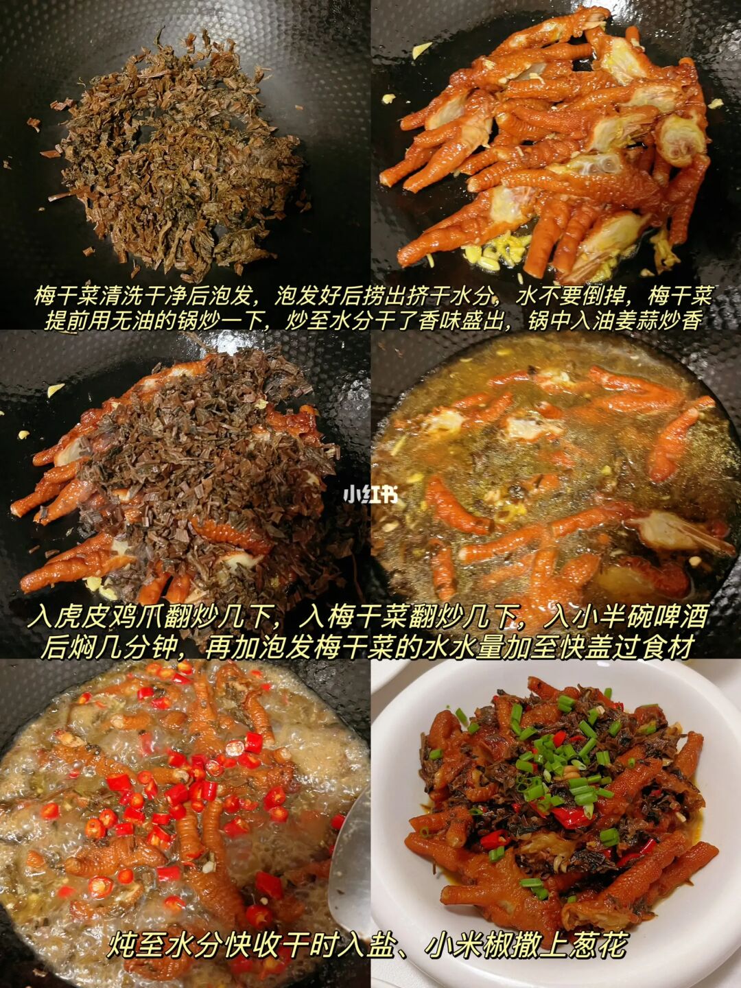 梅干菜清洗干净后泡发,泡发好后捞出挤干水分,水不要倒掉,留着备用,梅干菜提前用无油的锅炒一下,炒至水分干了香味出来,锅中入虎皮鸡爪翻炒几下,入梅干菜翻炒几下,入小半碗啤酒后焖几分钟,再加泡发梅干菜的水水量加至快盖过食材,炖至水分快收干时入盐、小米椒撒上葱花