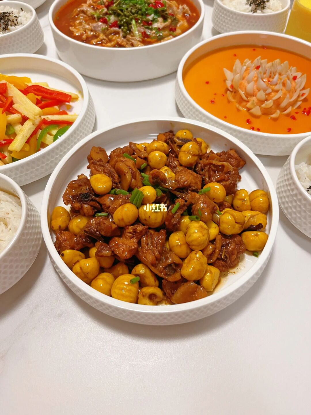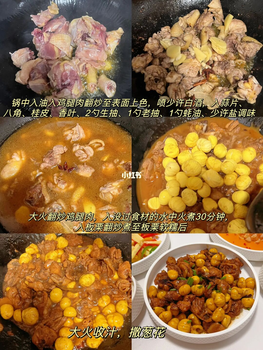 锅中入油入鸡腿肉翻炒至表面上色,喷少许白酒,入蒜片、八角、桂皮、香叶、2勺生抽、1勺老抽、1勺蚝油、少许盐调味,大火翻炒鸡腿肉,入没过食材的水中火煮30分钟,入板栗翻炒煮至板栗软糯后,大火收汁,撒葱花~