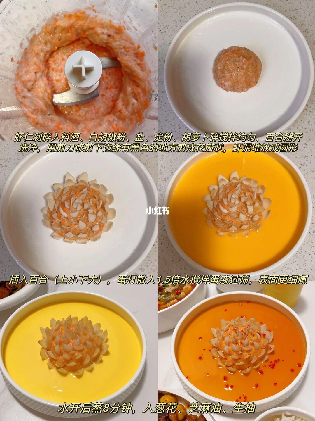 虾仁剁碎入料酒、白胡椒粉、盐、淀粉、胡萝卜碎搅拌均匀,百合掰开洗净,用剪刀修剪下边缘有黑色的地方剪成花瓣状,虾泥堆放成圆形,插入百合(上小下大),蛋打散入1.5倍水搅拌蛋液过筛,表面更细腻,水开后蒸8分钟,入葱花、芝麻油、生抽