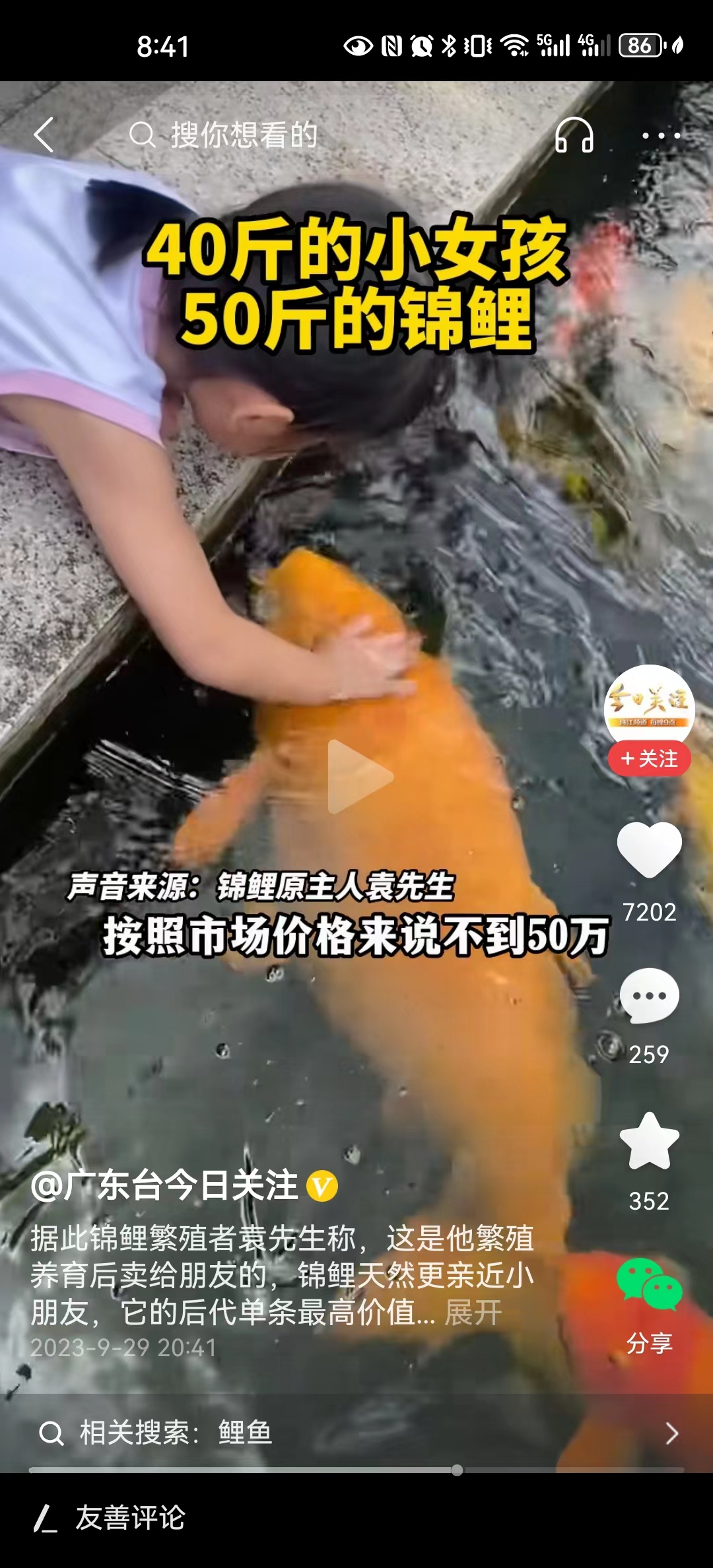 #一条50斤的锦鲤市场价卖到近50万#来自广东中山的养鱼人说,假如锦鲤能够养到7岁左右,50斤以上,市场价不到50万。很多人就理解一条鱼能卖50万。不到50万是多少钱呢?就如网上一个段子所言。两人相亲,问男孩你年薪多少钱?男孩说5万到50万。女孩直接说,那你年轻不就5万吗?如果你10万,你肯定说10万到100万喽。但是最少知道,养鱼人一年估计也卖不出去几条这么大的鱼。卖鱼也要等着碰“有缘人”。