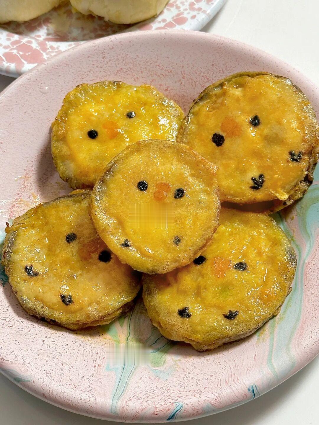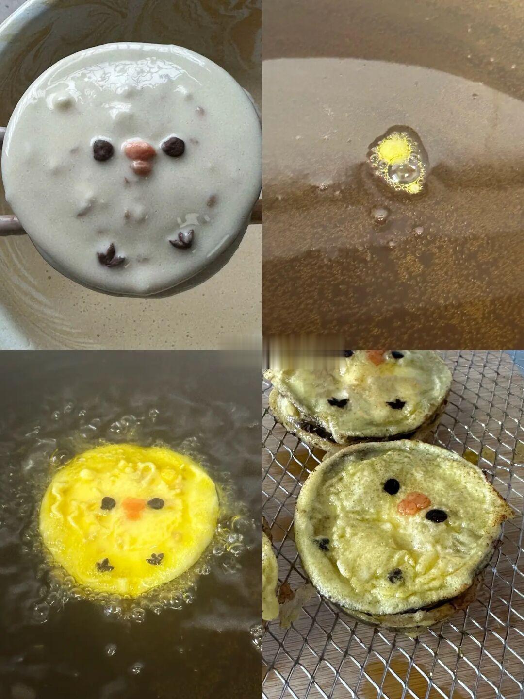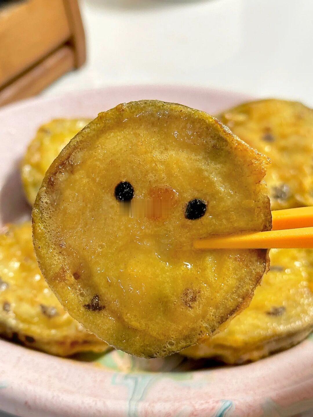 2.面糊配料混合,把茄饼裹一层面糊,装饰上小鸡表情,放入油锅小火炸至两面金黄捞出控油