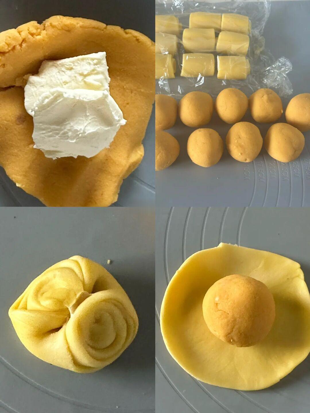 1.脱皮绿豆蒸熟,打烂过筛(如果打的细可以不用过),加入牛奶和糖炒成团,再加入蛋黄酱拌匀,再加入南瓜粉拌匀,冷却后分成30g一个包入7g奶酪备用