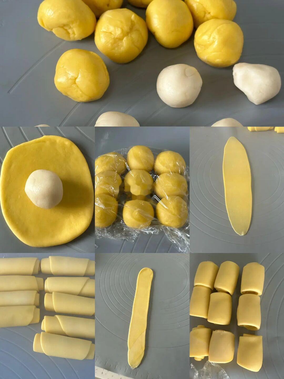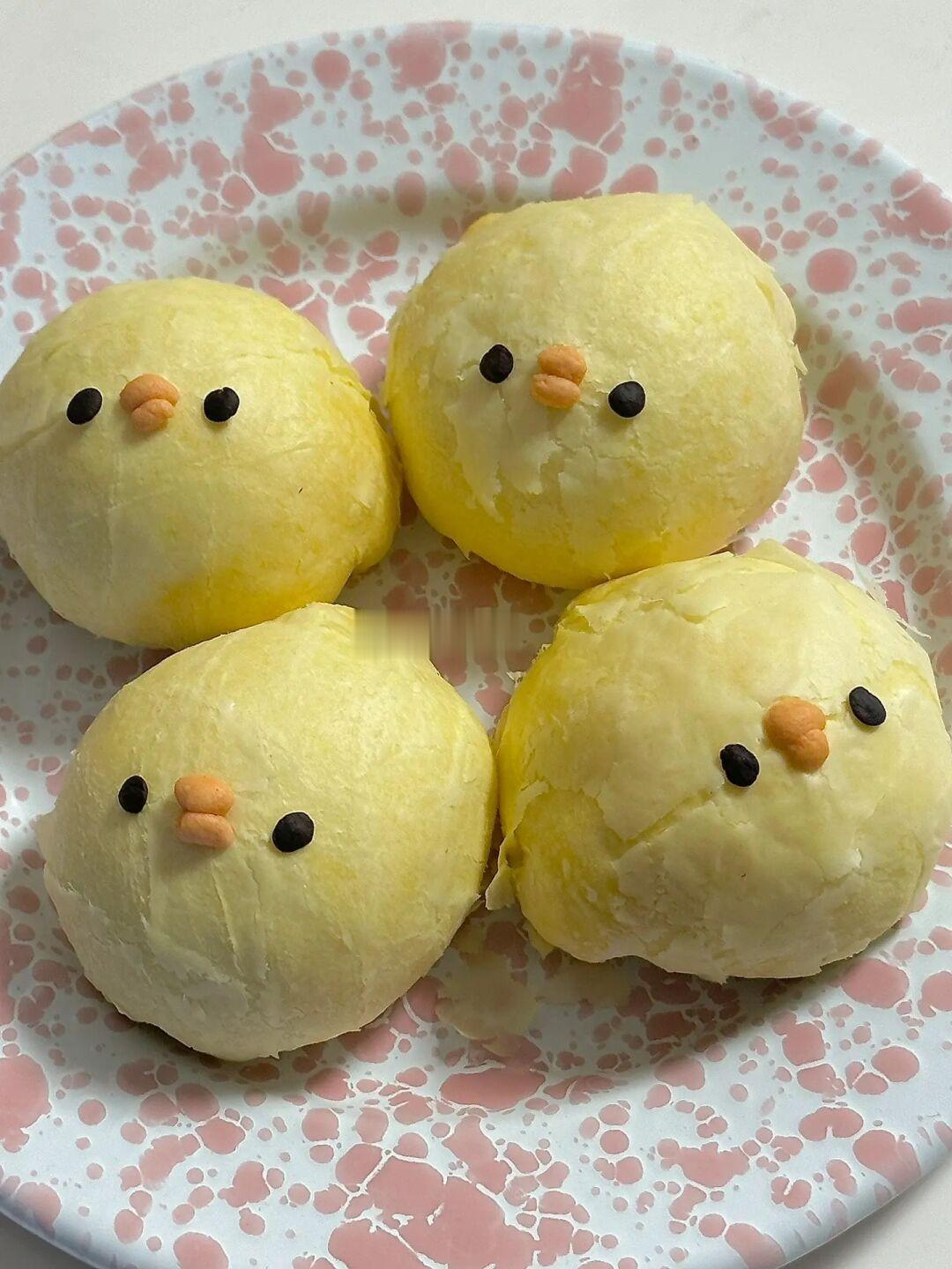 3.油酥混合分成7g一个,油皮包入油酥,擀成长条卷起,再擀成长条卷起,将两头捏拢擀扁包入馅料,装饰上小鸡脸