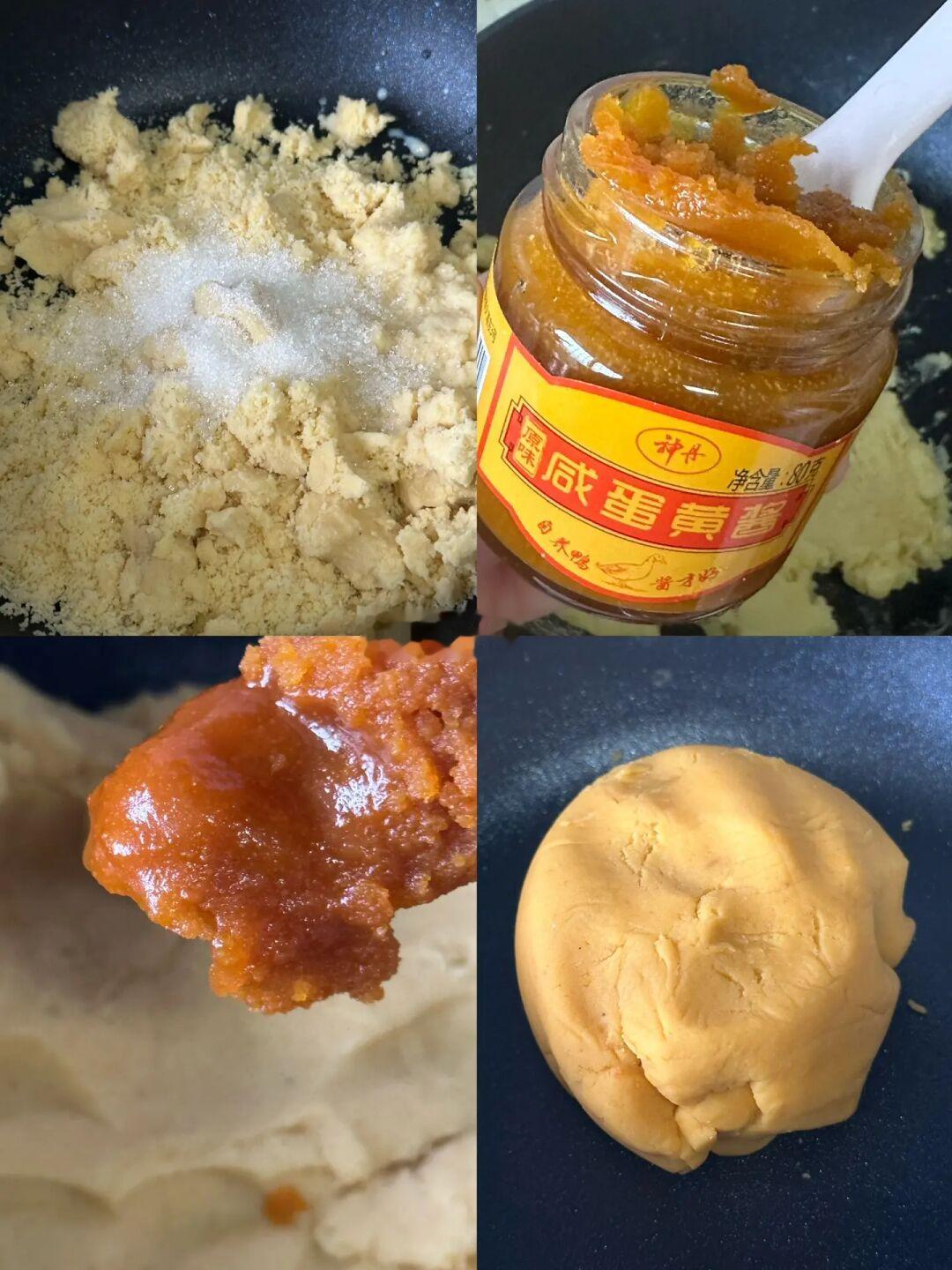 馅1: 200g熟脱皮绿豆泥、30g牛奶、18g糖、33g咸蛋黄酱(这个蛋黄酱一瓶是7个纯蛋黄做的,吃起来就像是那种很香很香的流油咸蛋的味道!放在饭里面做成饭团也好吃!!很适合我这种不喜欢咸蛋蛋白的人)、南瓜粉(调色)