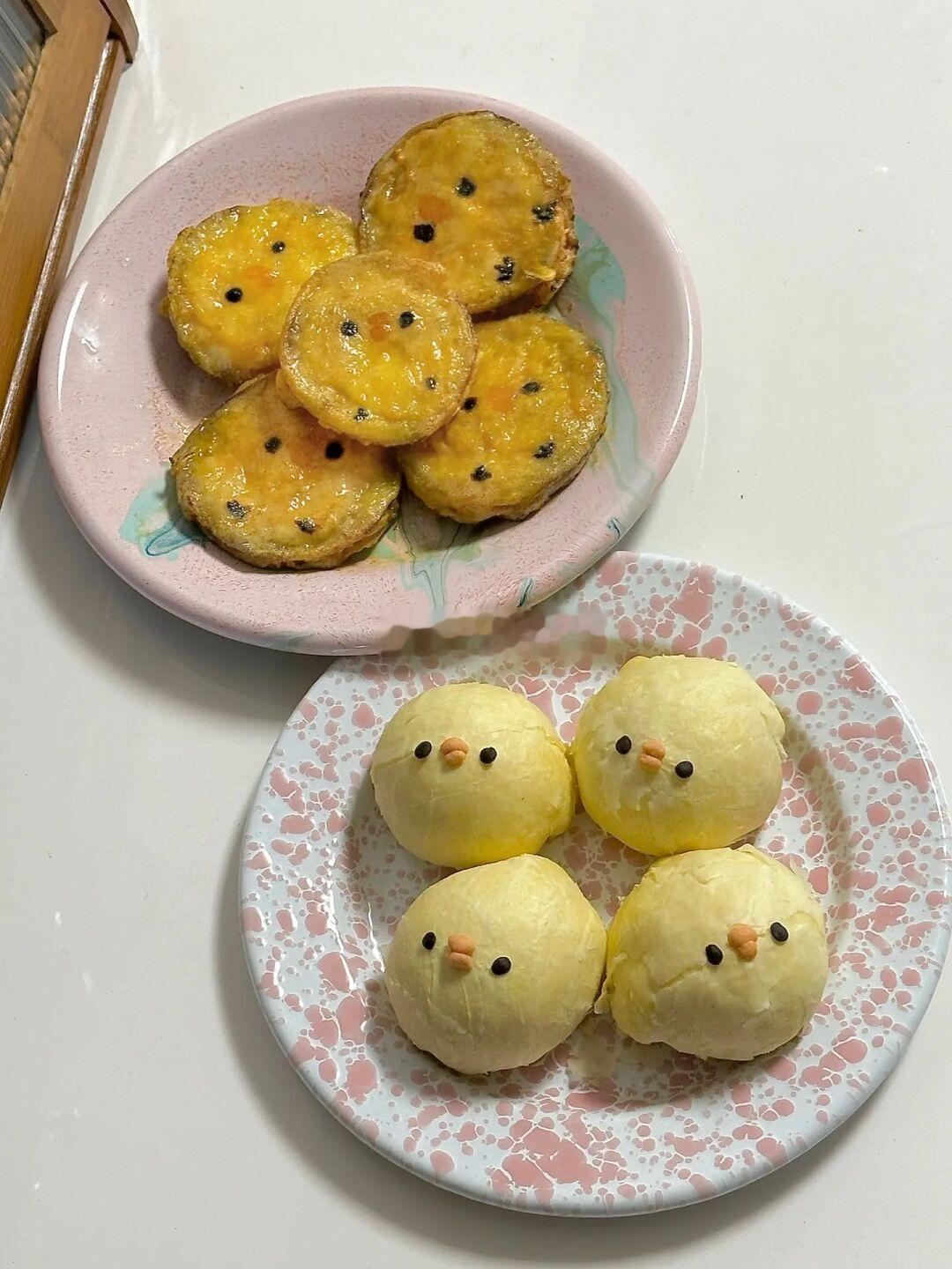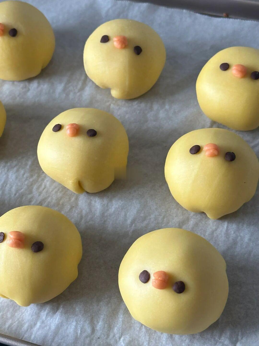 小鸡表情:面粉、水、调色(南瓜粉、红曲粉、可可粉)