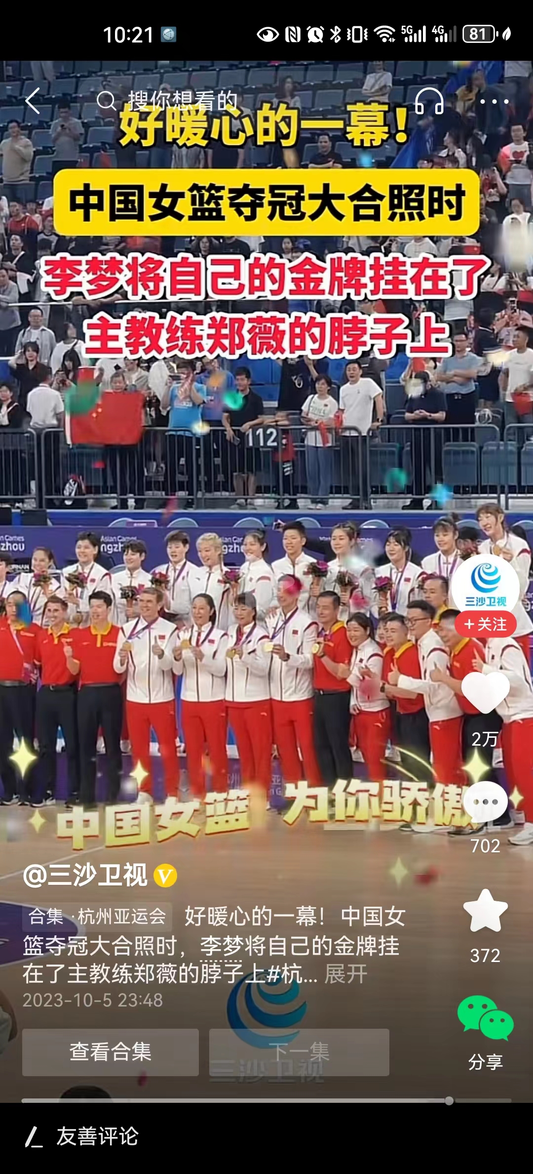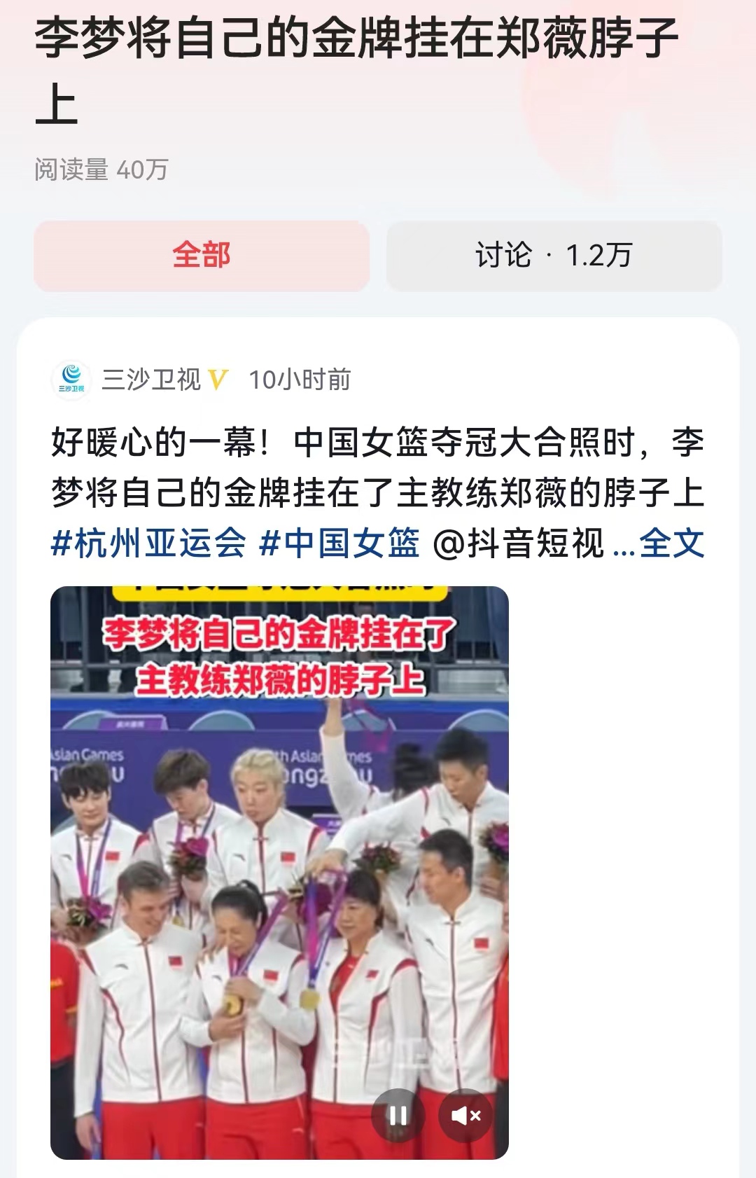 #李梦将自己的金牌挂在郑薇脖子上#中国女篮的李梦,其实情商挺高的,是一个非常感性的女孩,所以也传出了那么多事情来。在昨晚中国女篮获得冠军之后,教练组与女篮队员进行大合影。主教练郑薇站在前排中央,没想到从后面伸过来一个金牌挂在了她的脖子,回头一看,原来李梦将自己的金牌摘下来,挂在了教练脖子上。
