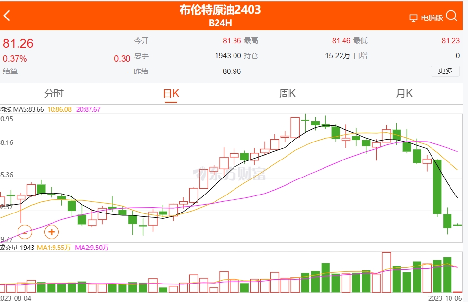 在10月4日,纽约WTI原油期货11月合约价跌5.61%,报每桶84.22美元/桶,创下自2022年9月以来的最大单日跌幅,布伦特国际原油价格表现也是如此。在10月5日继续下跌,纽约WTI原油日内跌幅一度达2%,跌至每桶82美元左右,布伦特原油价格实收84美元。在10月6日,国际原油价格还在下跌,现在布伦特原油价格每桶81.23美元。