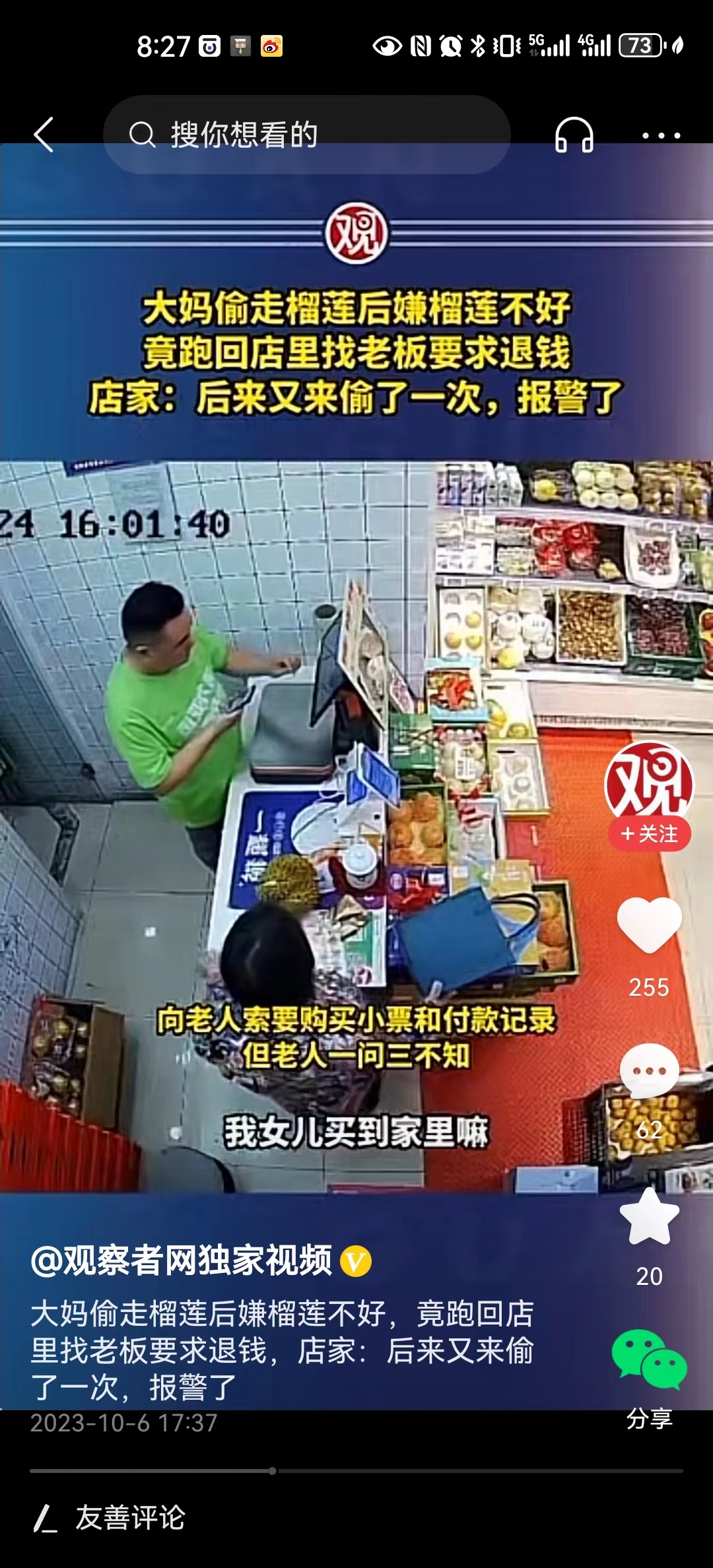 #大妈偷榴莲后嫌不好 竟找老板退钱#见过如此厚颜无耻的老人吗?浙江南浔某水果店发生了这个奇事。一位老妇人偷了店家榴莲,发现有点不好,竟然回来找老板退钱。但没想到老板知道这是一个坏榴莲,本来就放在旁边,没想到被老妇人给偷了。店家于是假装不知索要付款小票,老人谎称女儿买的,他也没手机,不记得女儿号码,最后又走了。