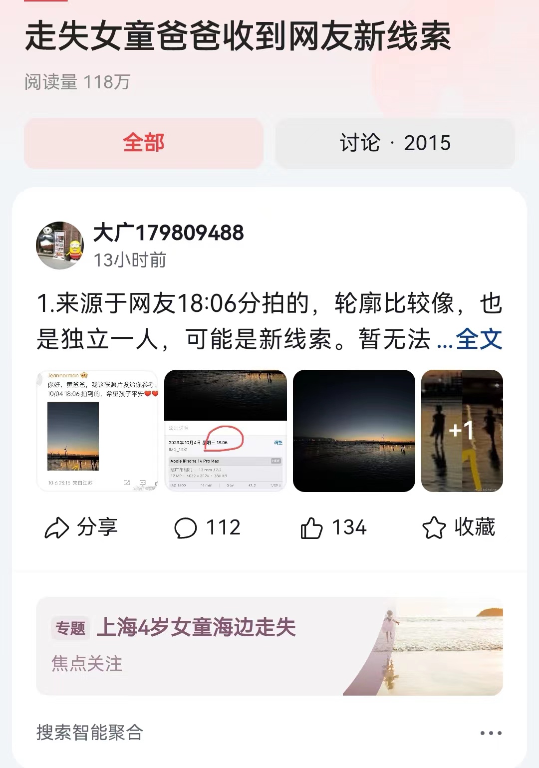 据说有网友提供了新线索,在一个动车上发现了疑似4岁半女童的小孩,希望这个消息尽快提供给警方,而且进行警方排查。现在蓝天救援队内部也有一些纷争,有一个蓝天救援队账号宣称于10月7日晚上因为外部原因终止救援活动。但是今天又有另外一个蓝天救援队账号宣称还在救援,发消息的是另一波蓝天救援队。但是不论如何,这并不意味着对于这个4岁半小女孩的救援就没有了。上海浦东警方及相关机构还在搜寻,最新的消息是搜寻区域都已经扩大到浙江舟山范围。 小女孩出示的这片海滩是在浦东最南边,是在南汇的滴水湖旁边的海域,隔海相望的就是洋山港以及浙江舟山区域。之前警方已经联络了海事大学和海洋大学的专家,判断水流方向,所以向这个方向展开扩大搜寻。 从10月4日到现在已经90个小时过去了,上海浦东机场以及蓝天救援队,已经投入大量的公共资源。 这个4岁半女童的命运牵动着千百万网友的心。有些网友去抓女孩父亲和母亲的私人账号信息,提出一些让人毛骨悚然的假设。这是非常不对的,我们还是要以极大的善意去理解这个事件。虽然这个父亲的做法非常不妥当,造成的后果也很严重。但是毕竟他们一家丧失了自己可爱的女儿,而且也动用了大量的公共资源。 真的希望出现奇迹,虽然微乎其微,但是仍然盼望。
