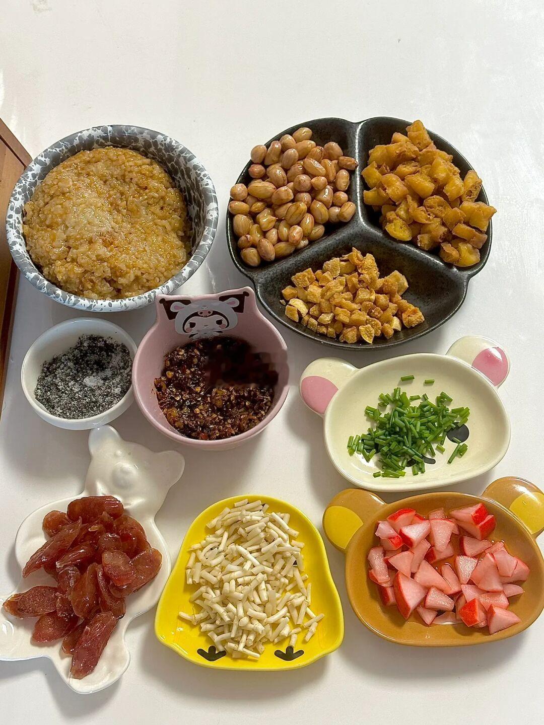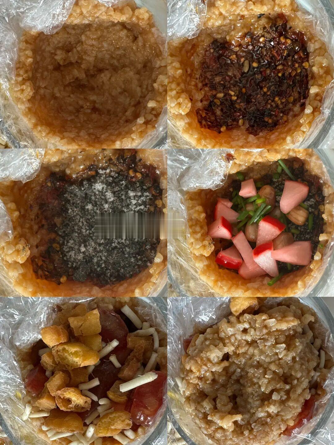 7.糯米在保鲜膜上铺好,分别依次加入辣酱、芝麻糖、花生、油条脆、折耳根、泡萝卜、葱花、脆哨、腊肠,再铺一层糯米饭包好