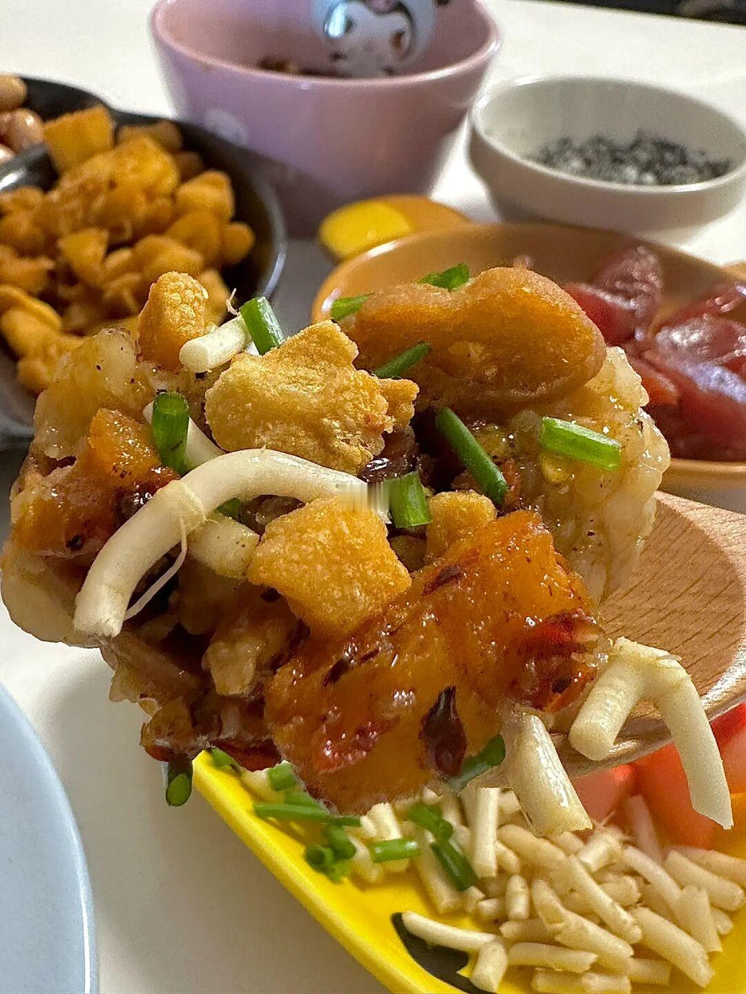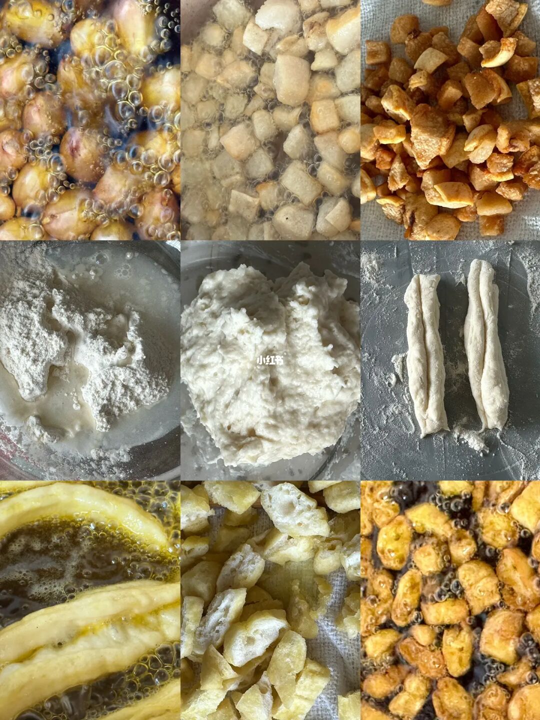 3.倒掉锅中的油,加入肥肉块,小火慢慢炸至肉变成金黄色(注意飞溅),捞出脆哨控干油分,冷却备用,剩下的油备用