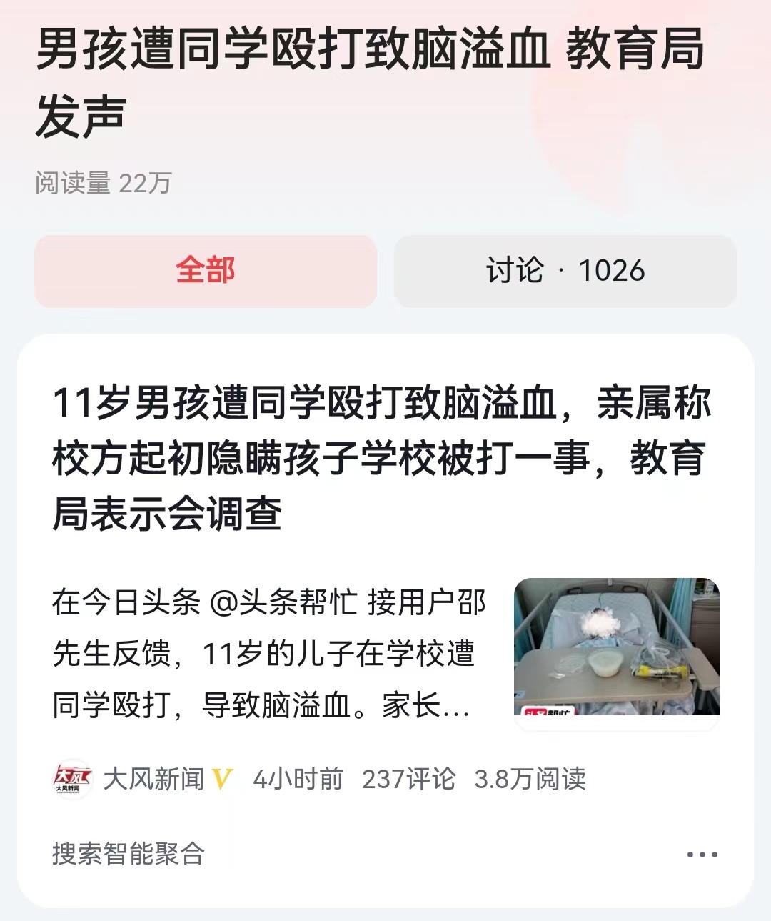 #男孩遭同学殴打致脑溢血 教育局发声#又一起严重的疑似校园霸凌事件,事情的后续也是如此,校方不愿直接回应,说既然双方已经报警了,那么等警方的调查报告。但是假如校方隐瞒情况不告诉家长,耽误了病情,让孩子落下了后遗症,这又算谁的责任呢?