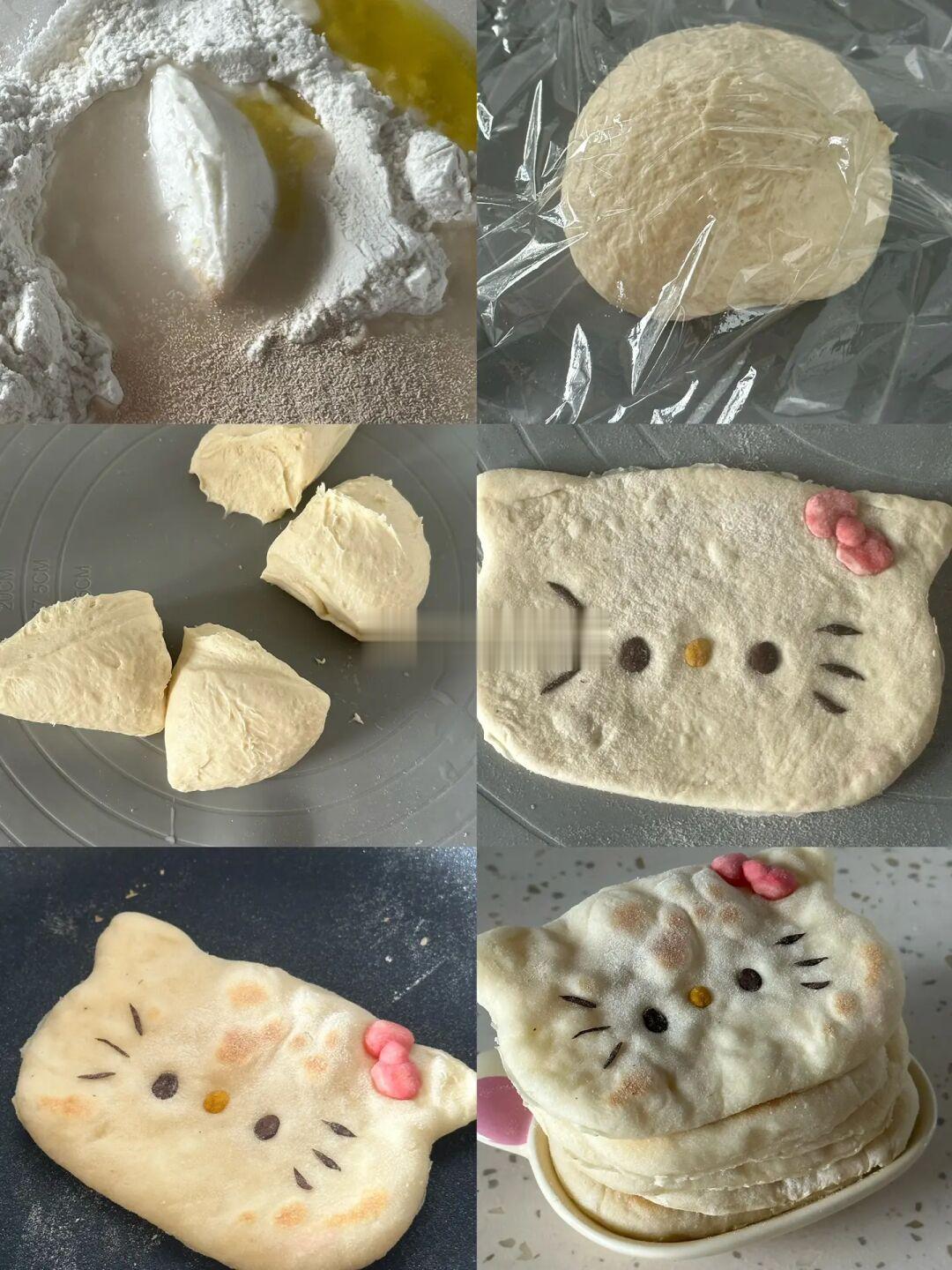 2.面垫撒面粉防粘,面团分份擀扁,做出猫猫头(可以用模具或者杯子来压),装饰上表情,干净的平底锅两面小火烙熟