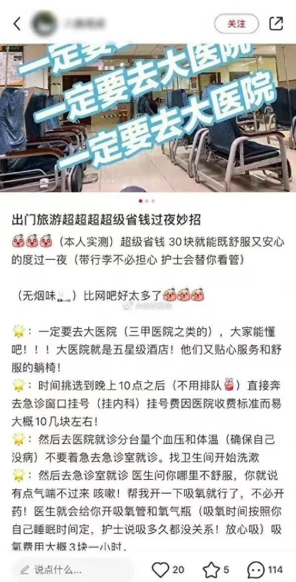 他在文章里面,还专门沾沾自喜的说自己已经实测过了,这个省钱妙招有效,而且靠谱,同样放之四海而皆准。那就是如果不想住酒店或者找不到住宿地方,那就去当地最好的医院,三甲医院优先,然后挂一个急诊,说要去看病。记住晚上10:00之后挂急诊号,在等待期间可以先使用医院的卫生间进行洗漱。