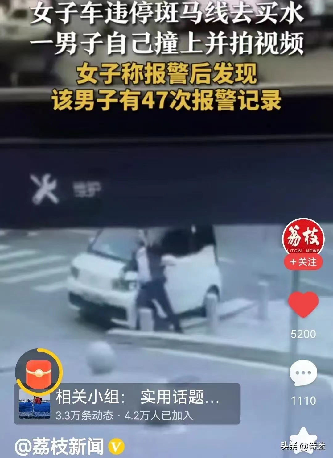 女子违章停车然后下车去买水,结果堵住了步行的路口。男子走过去撞到了车上,并拍视频。有可能男子找到女子要求赔偿,女子报警之后,发现男子曾经有过47次报警记录,怀疑是敲诈勒索。
