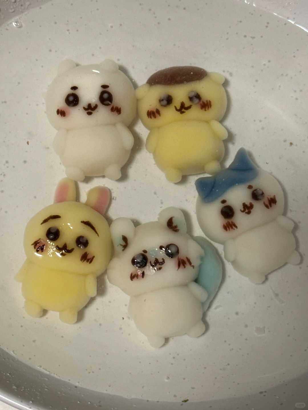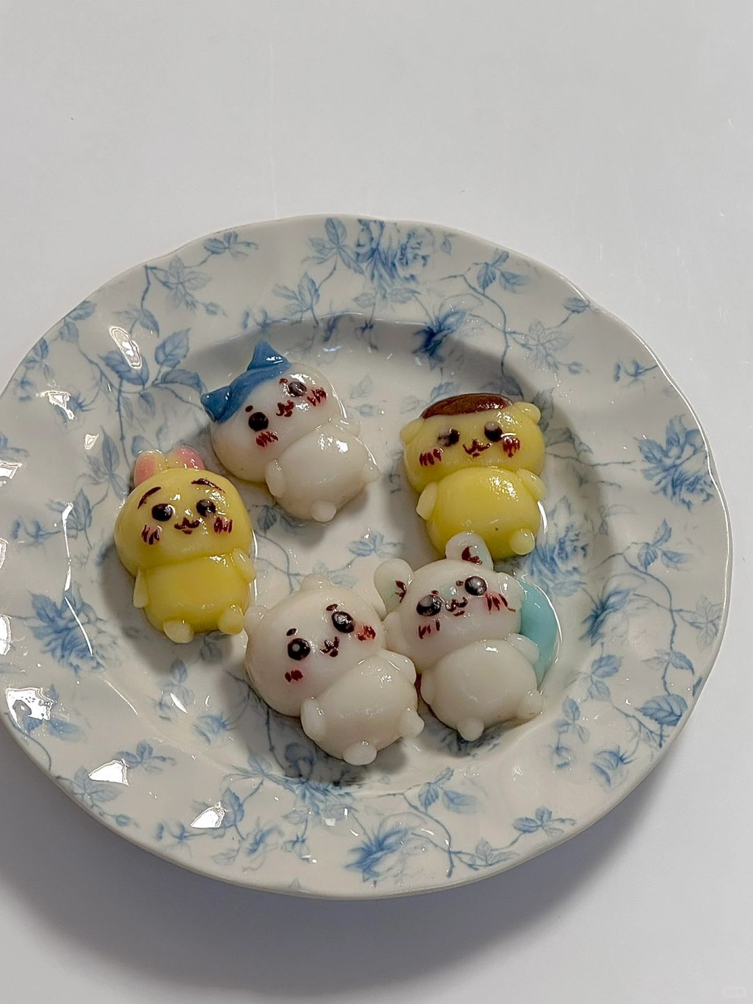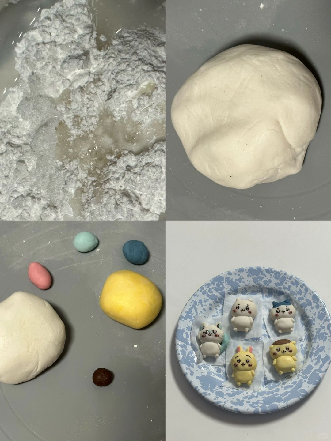 2.年糕配料混合,揉成团,分份调色,分别捏出宝宝们的形象,放在烘焙纸上防粘