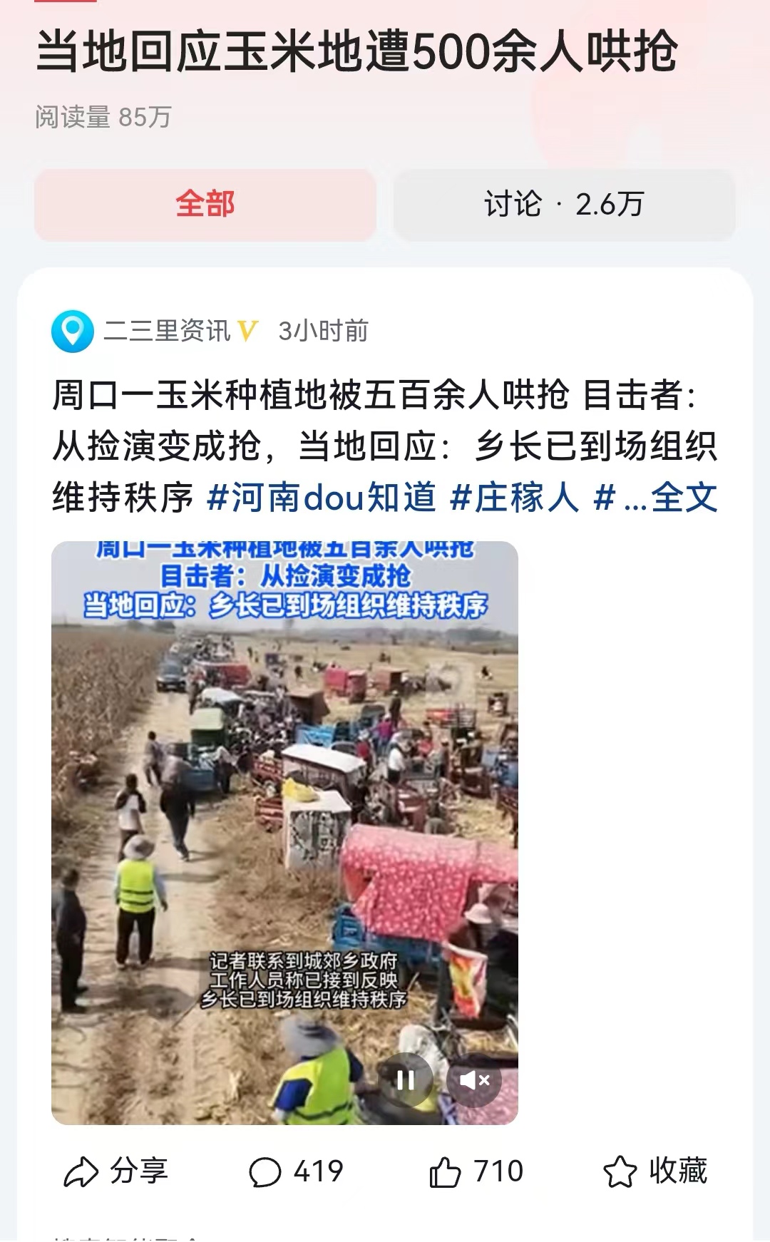 河南周口郸城城郊乡,发生了一起性质恶劣的哄抢玉米事件。一个农业公司,包种了当地2000多亩地。现在玉米成熟了,收割机开始进场收割玉米。当地村民闻风而动,先是跟在收割机后面,在地里捡那些没有被收割的玉米。在之后,村民越聚越多,直接就开始奔向那些没有被收割的田地,直接哄抢玉米。