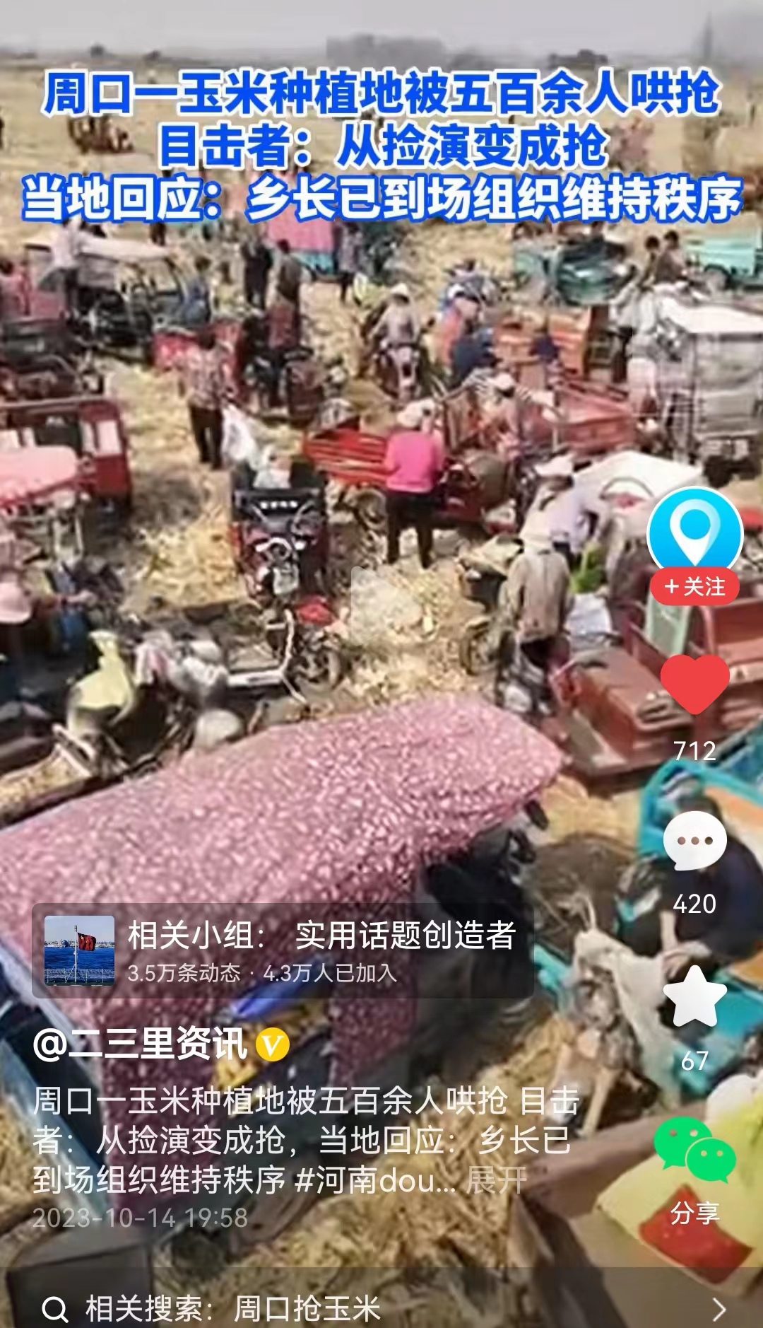 农业公司也报了警,警方也出了警,警笛在现场长鸣。但是当地村民仍然在哄抢,农业公司的人员说被哄抢的土地面积达到四五百亩。当地道路也已经被堵塞,从现场视频来看,甚至还出动了农用车进行装载,不仅仅是电瓶车和小三轮了。#河南疯抢玉米#