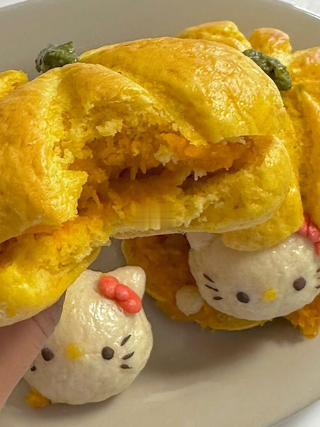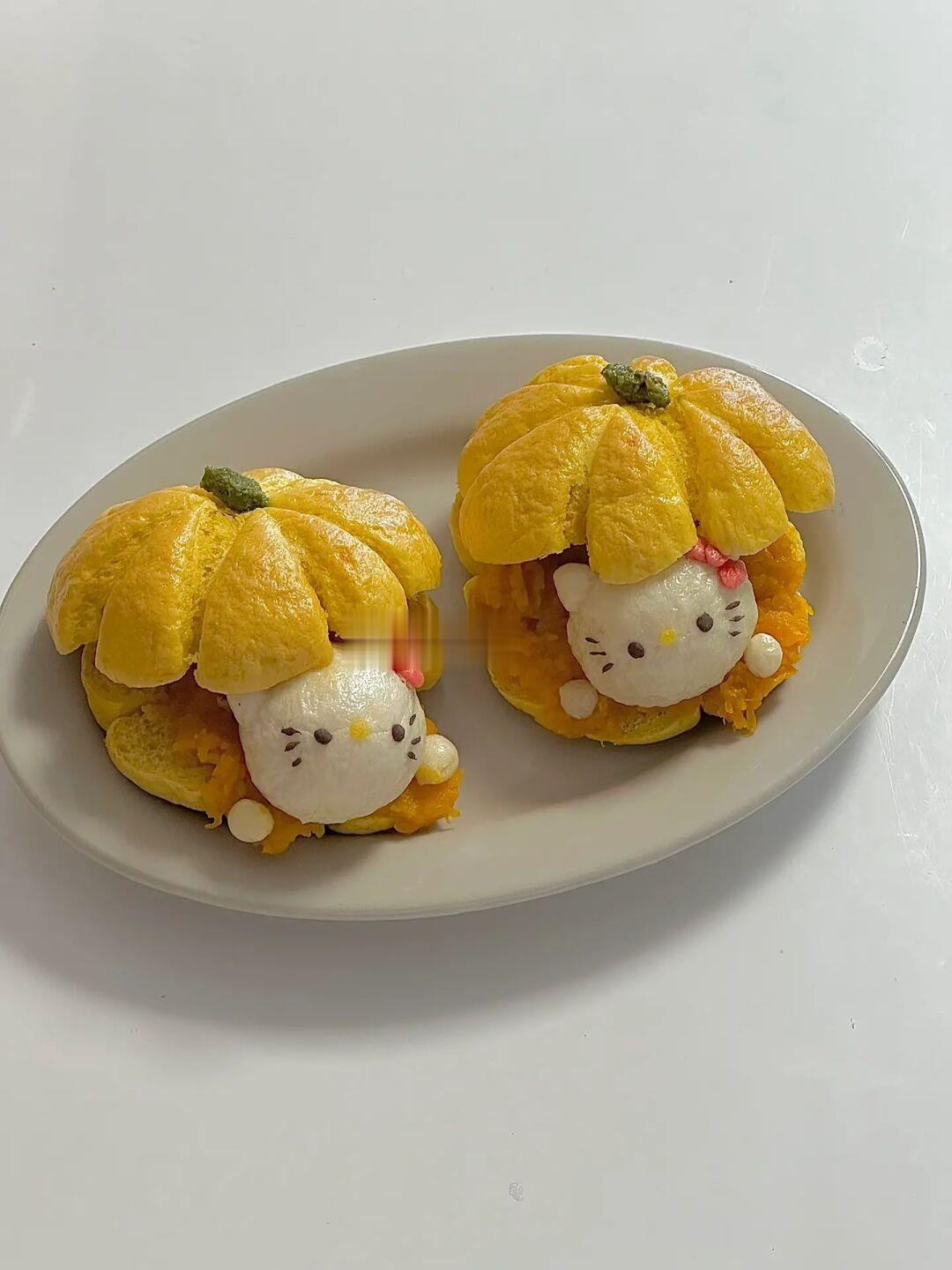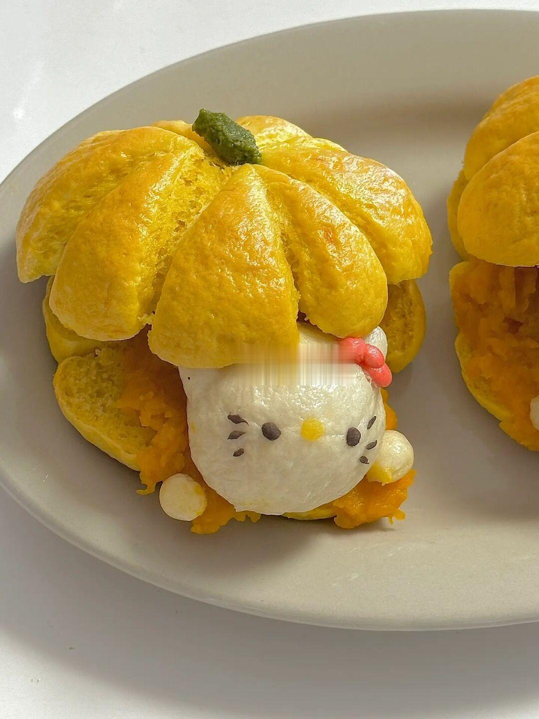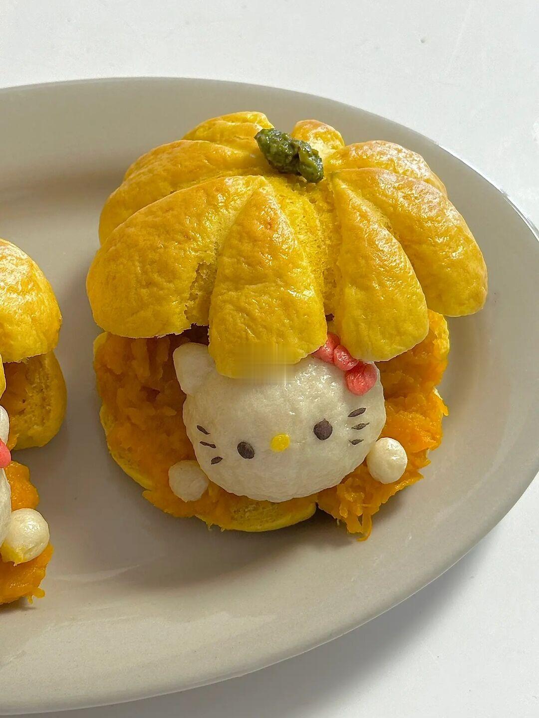 6.冷却后对半切开抹上南瓜泥,夹上kitty
