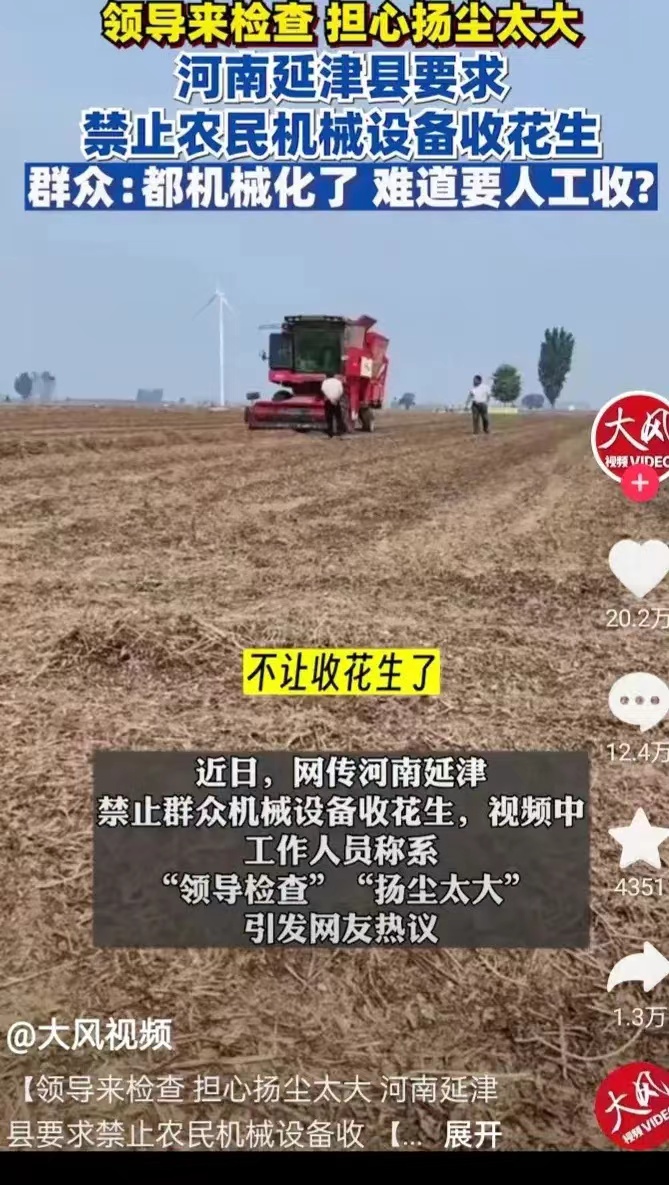在河南延津,乡政府派人下来,禁止农民用农业机械收花生。理由是扬尘太大了,有领导下来。意思想等着领导走了,再可以继续收。农民真的挺气愤,询问工作人员:"老百姓不让收(花生)难道要下雨收?""谁说不让收?让收,扬尘太大。"群众多次询问"让收"应该怎么收?确实,我想这名工作人员也是无言以对。