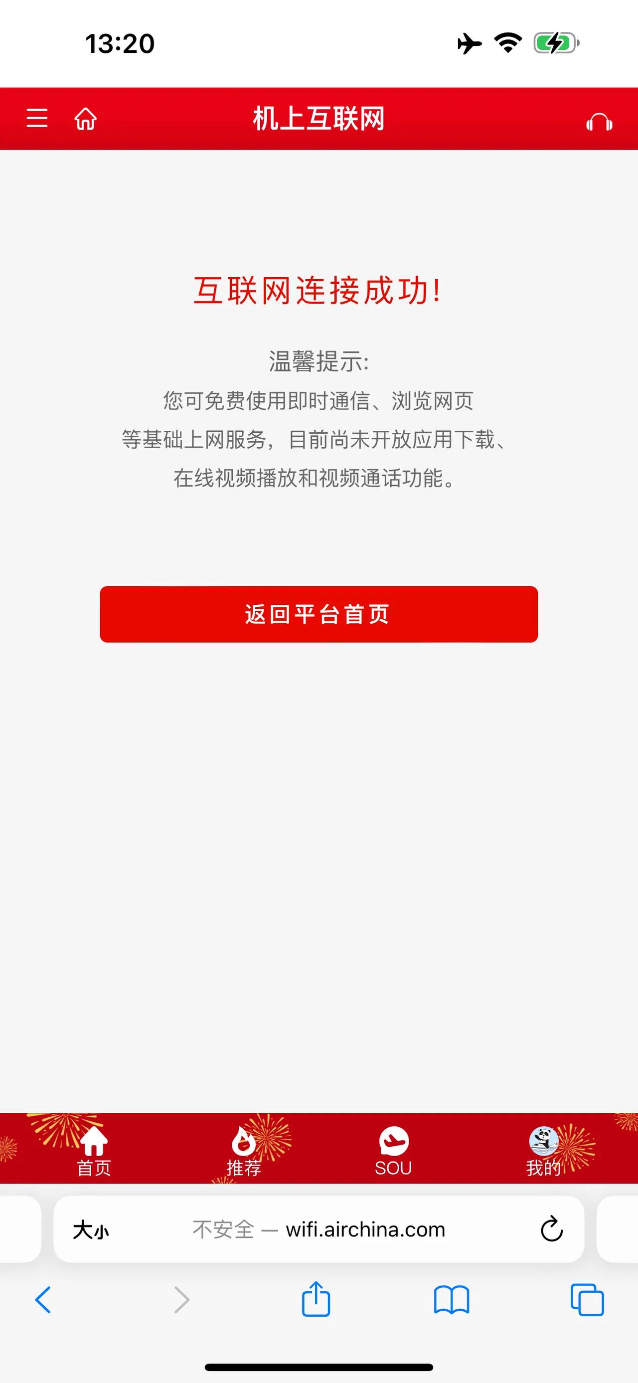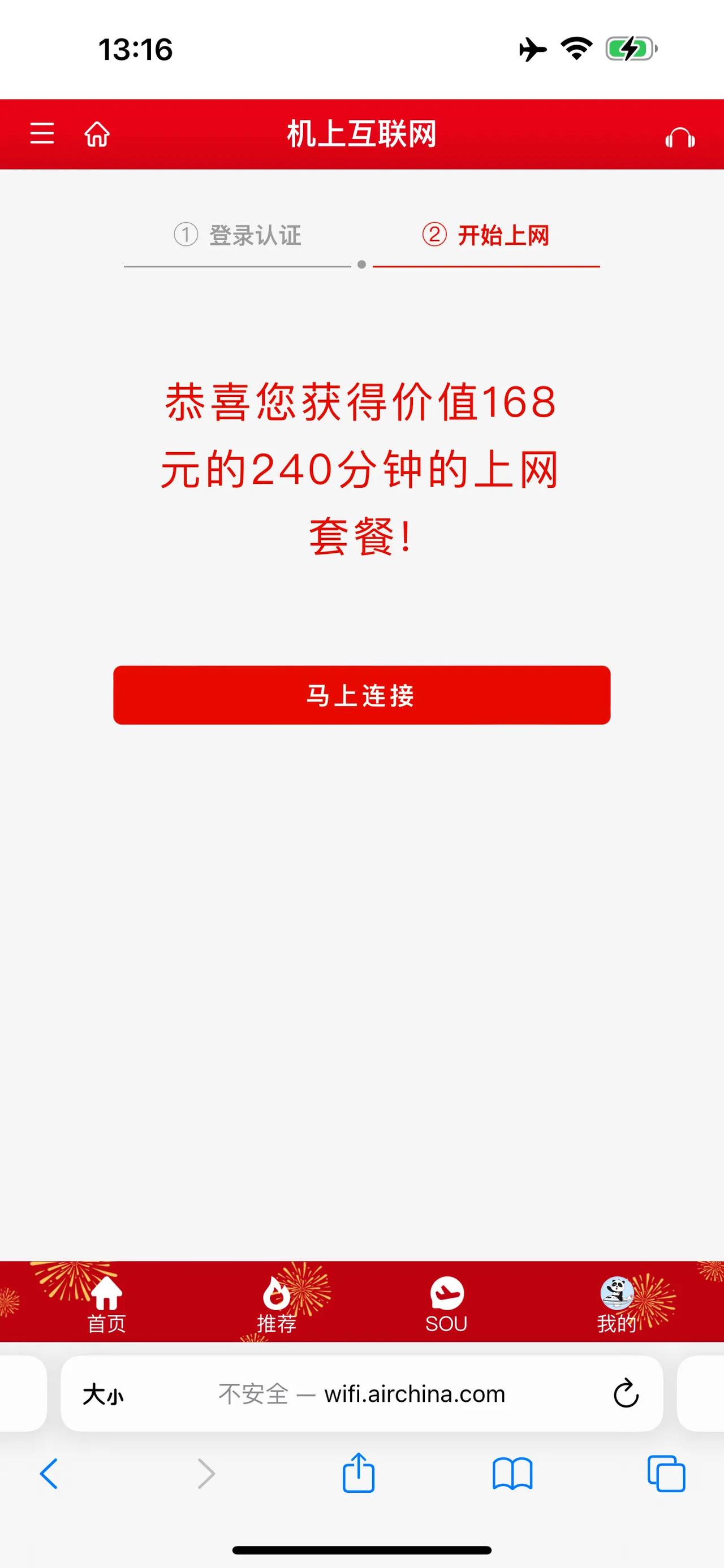 这次连上了国航的免费WiFi,速度还行,基本可用。现在是推广阶段么?所以免费体验