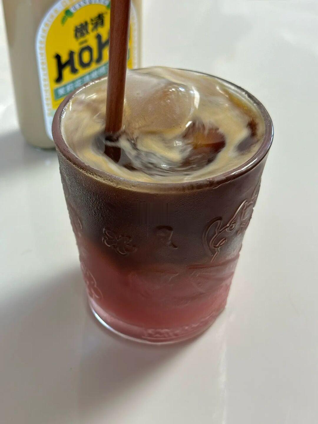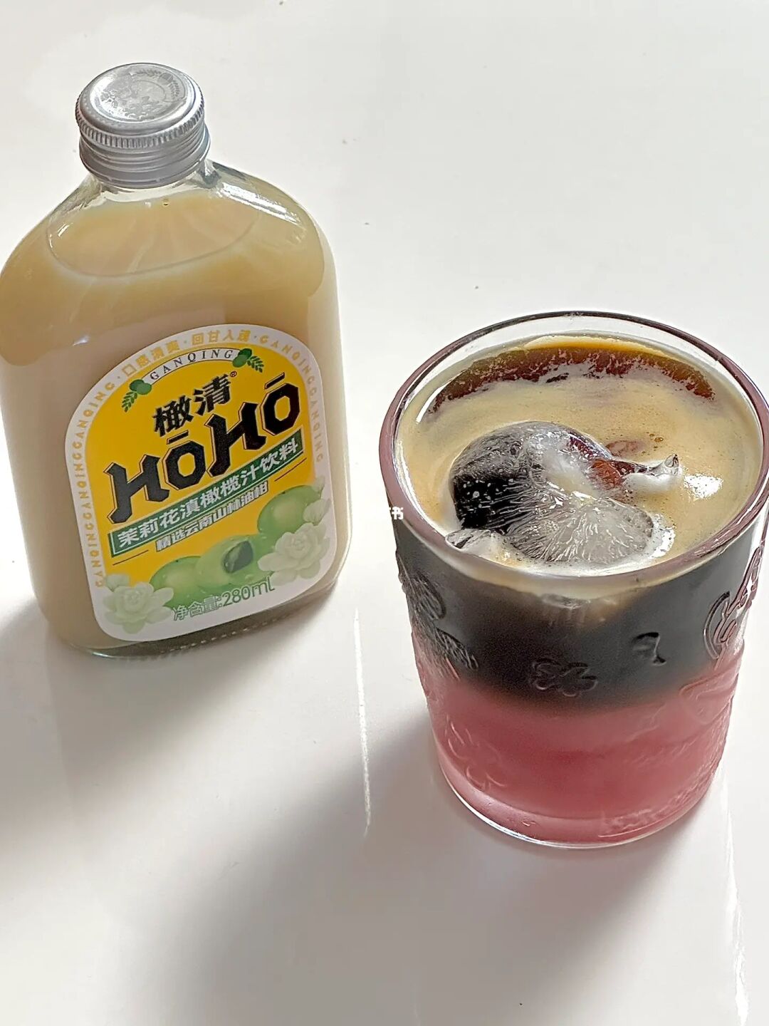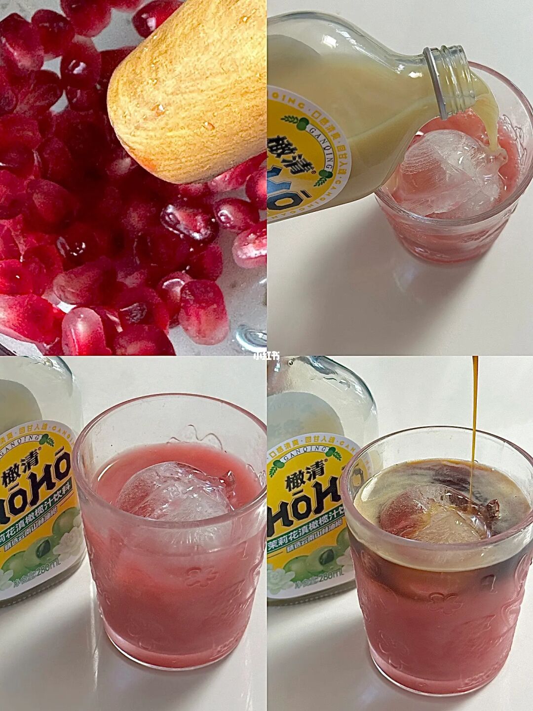 石榴油柑美式:石榴、咖啡液、冰块、茉莉花橄榄汁饮料(橄榄富含VC和SOD成分,一颗的含量堪比6个苹果,对皮肤很好~这款饮料是橄清的,酸酸甜甜很适口!入口很快就会回甘,口感真的很奇妙很上头!还能喝到茉莉的清香,很适合吃油腻大餐的时候喝,真的很解腻!)