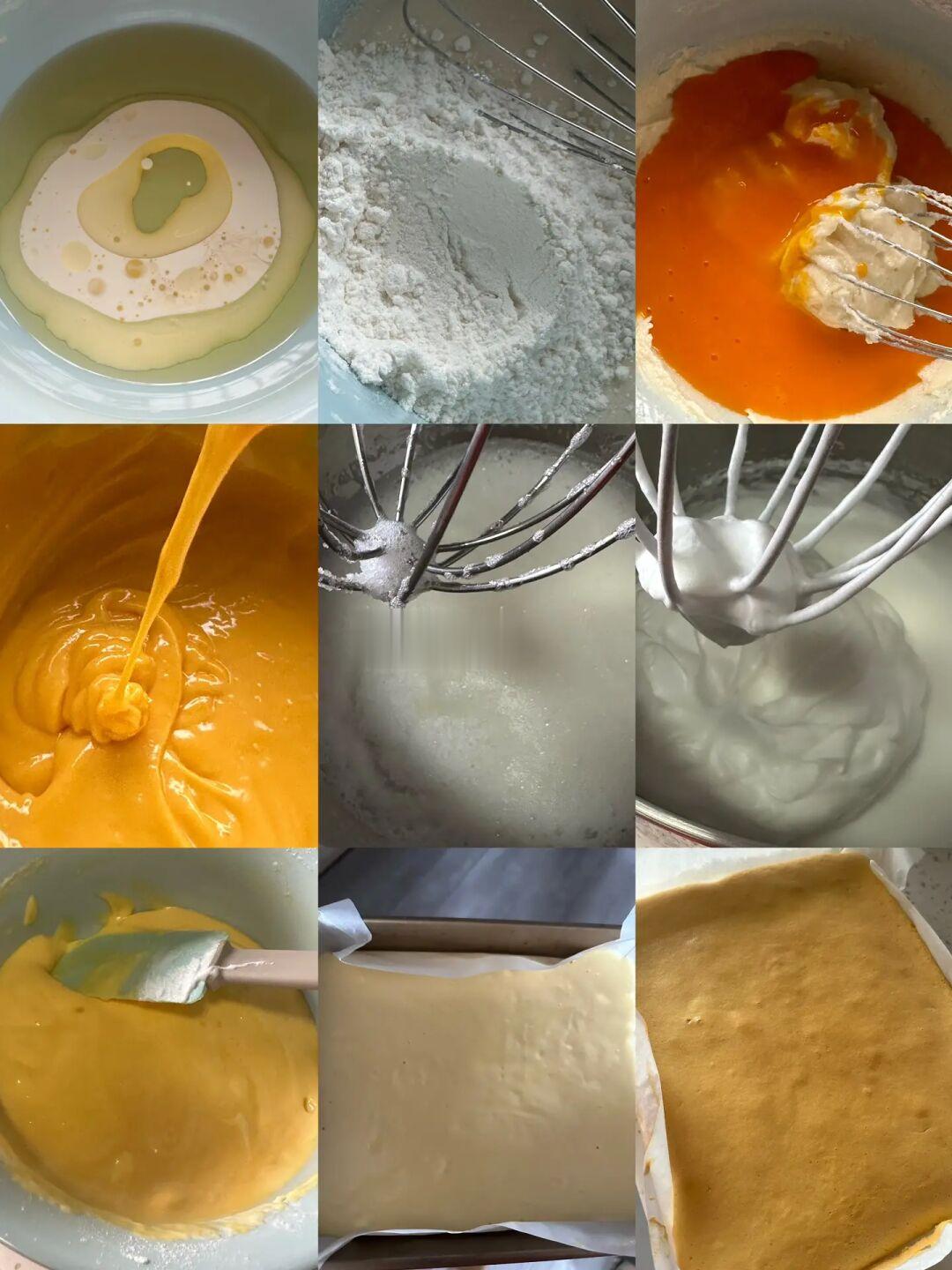 蛋糕胚:4个蛋(蛋黄、蛋清分离)、40g糖、45g油、45g奶油、10g牛奶、50g低筋面粉