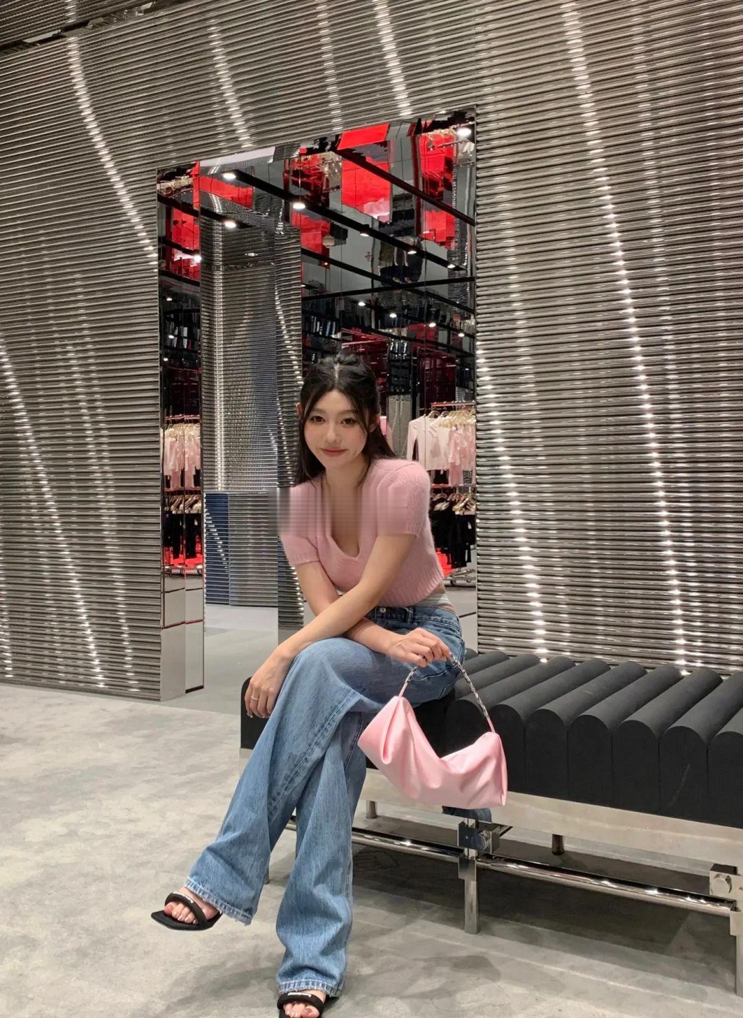 粉色短袖毛衣配设计大胆的牛仔裤,