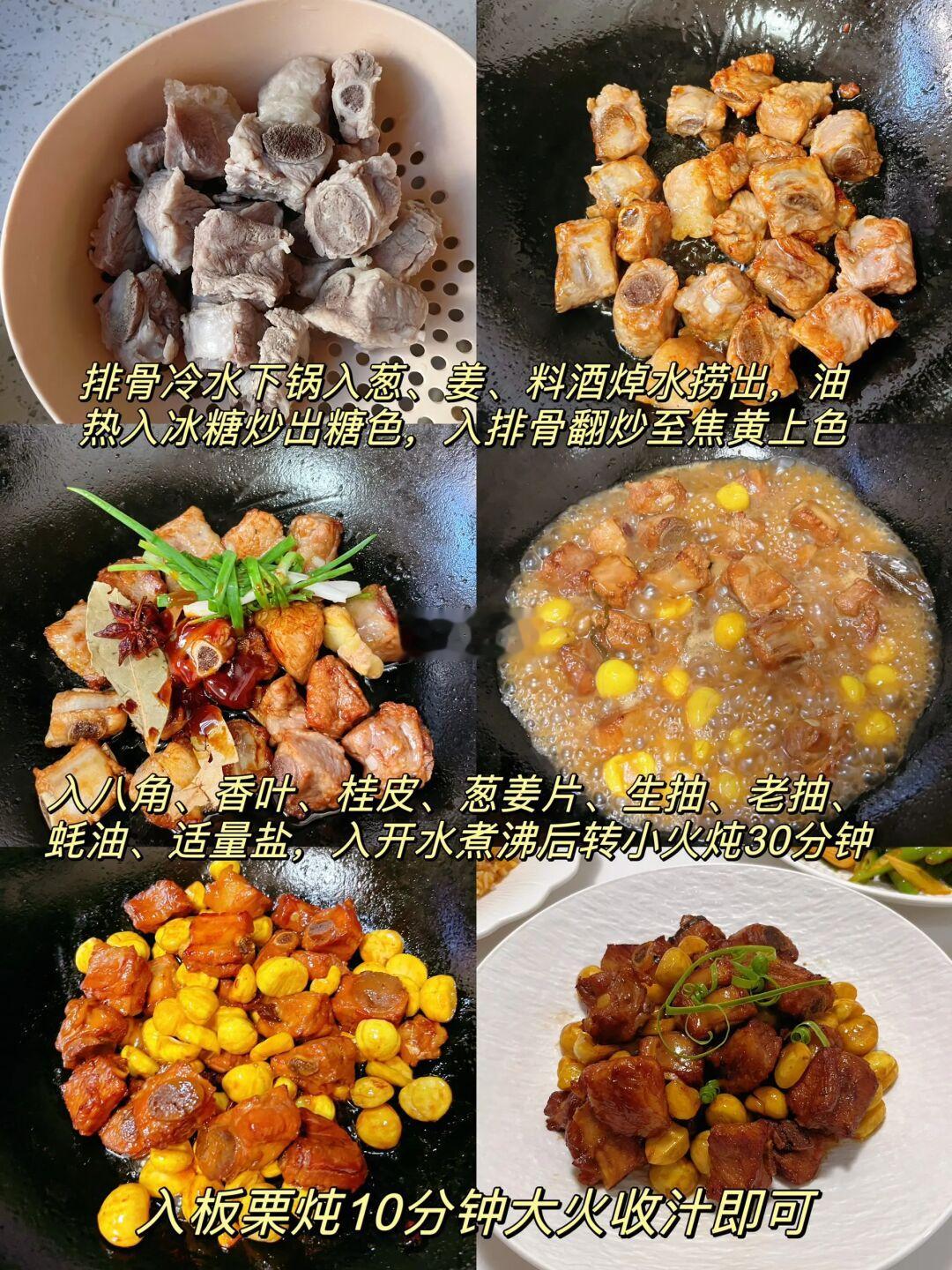 排骨冷水下锅入葱、姜、料酒焯水捞出,油热入冰糖炒出糖色,入排骨翻炒至焦黄上色,入八角、香叶、桂皮、葱姜片、生抽、老抽、蚝油、适量盐,入开水煮沸后转小火炖30分钟,入板栗炖10分钟大火收汁即可