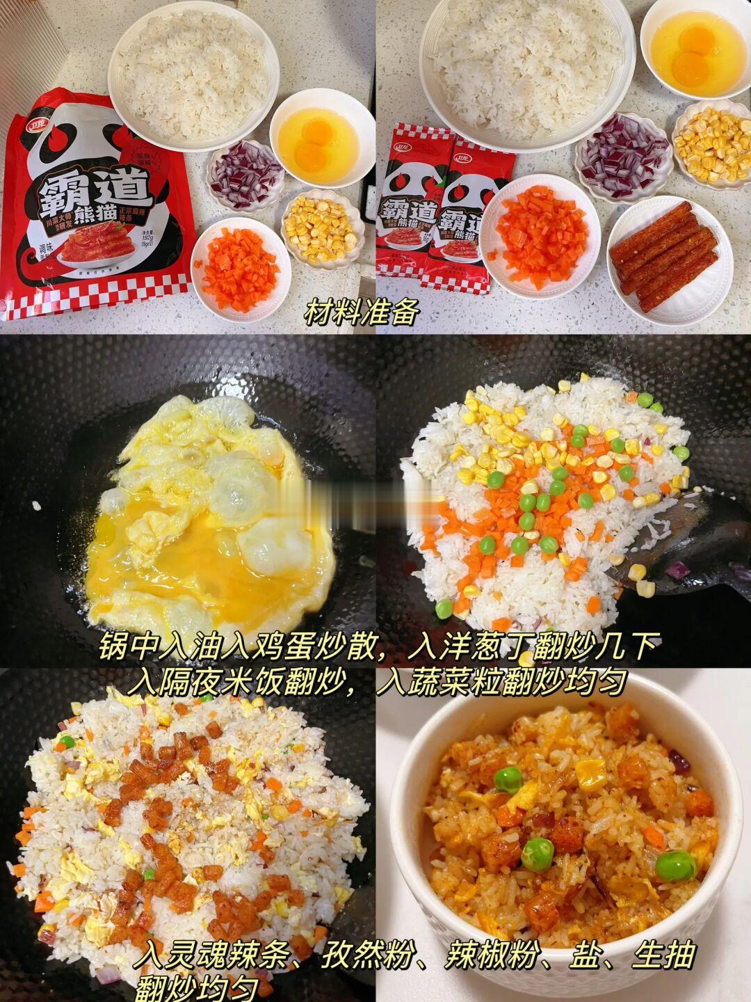 材料准备,锅中入油入鸡蛋炒散,入洋葱丁翻炒几下,入隔夜米饭翻炒,入蔬菜粒翻炒均匀,入灵魂辣条、孜然粉、辣椒粉、盐、生抽翻炒均匀