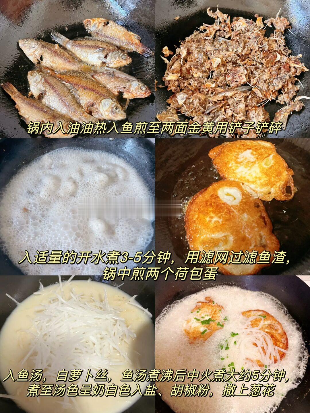 锅内入油油热入鱼煎至两面金黄用铲子铲碎,入适量的开水煮3-5分钟,用滤网过滤鱼渣,锅中煎两个荷包蛋,入鱼汤、白萝卜丝,鱼汤煮沸后中火煮大约5分钟,煮至汤色呈奶白色入盐、胡椒粉,撒上葱花