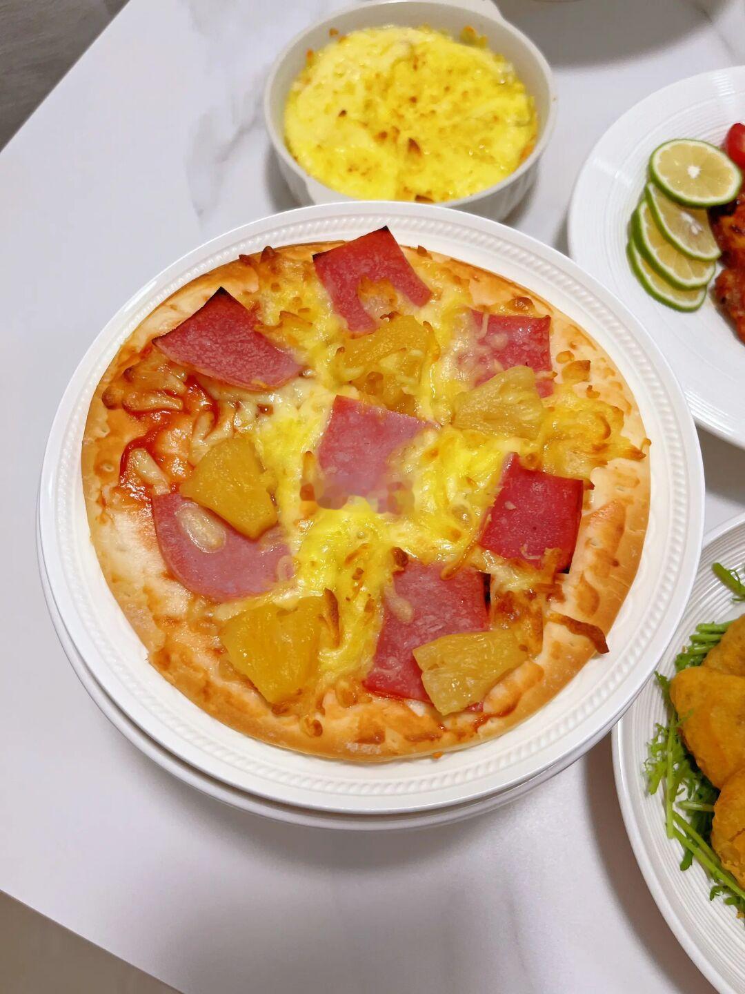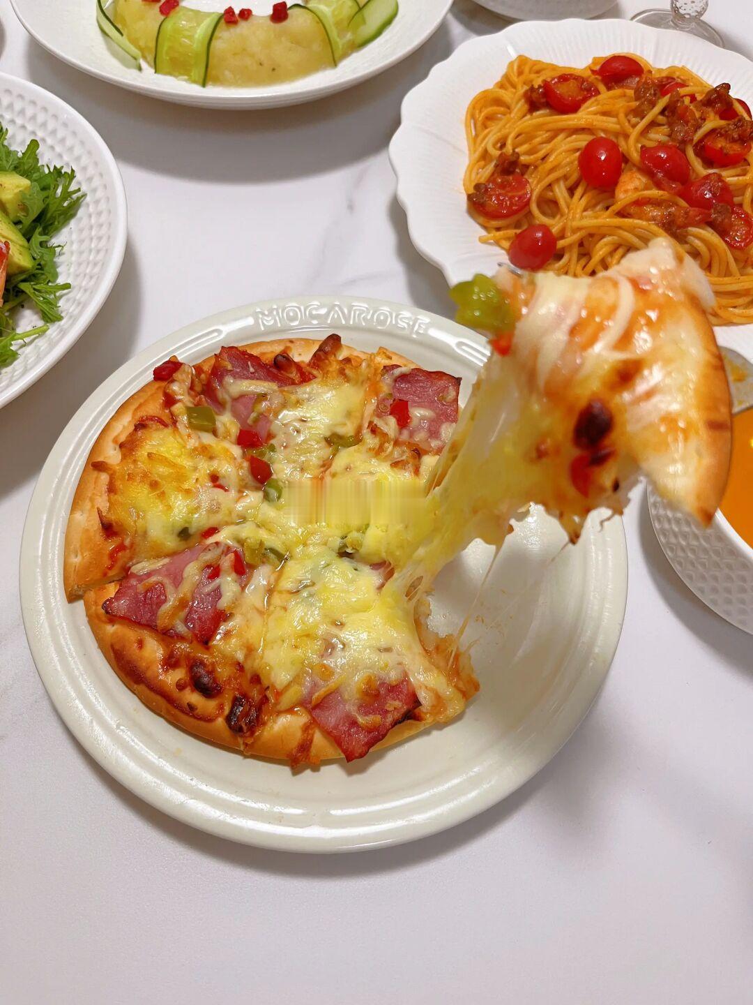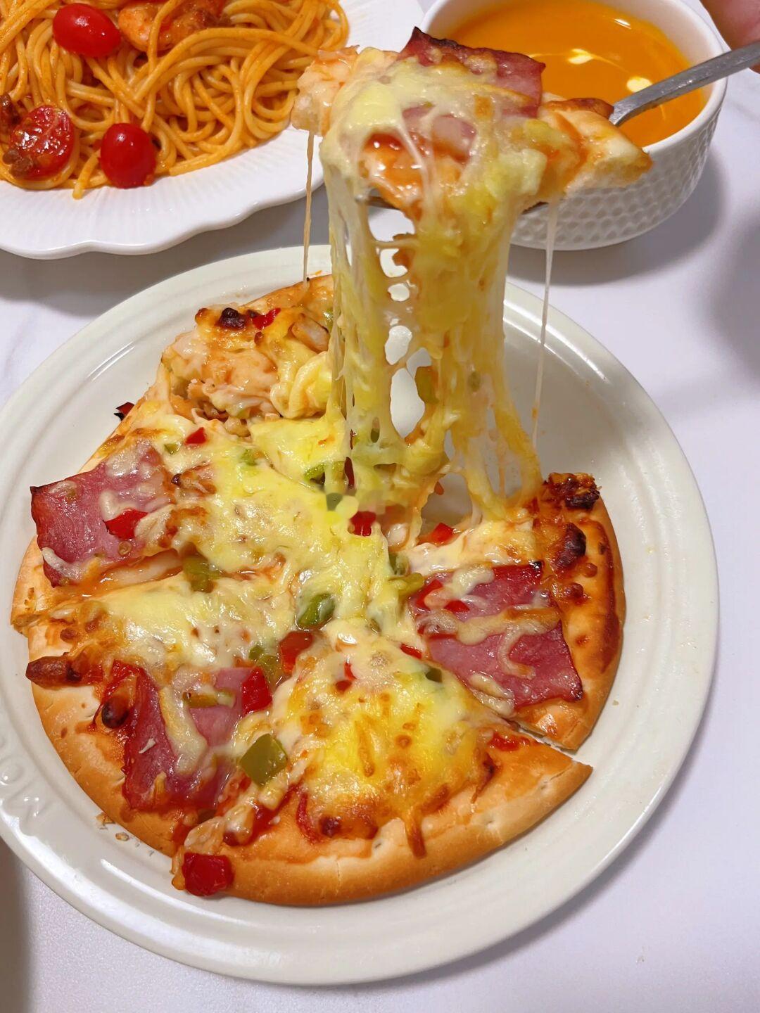 之前活动囤了4盒披萨,小朋友放学的路上喊着想吃披萨,老母亲安排起来,大口培根搭配拉丝的芝士,一下子就能光盘的节奏~