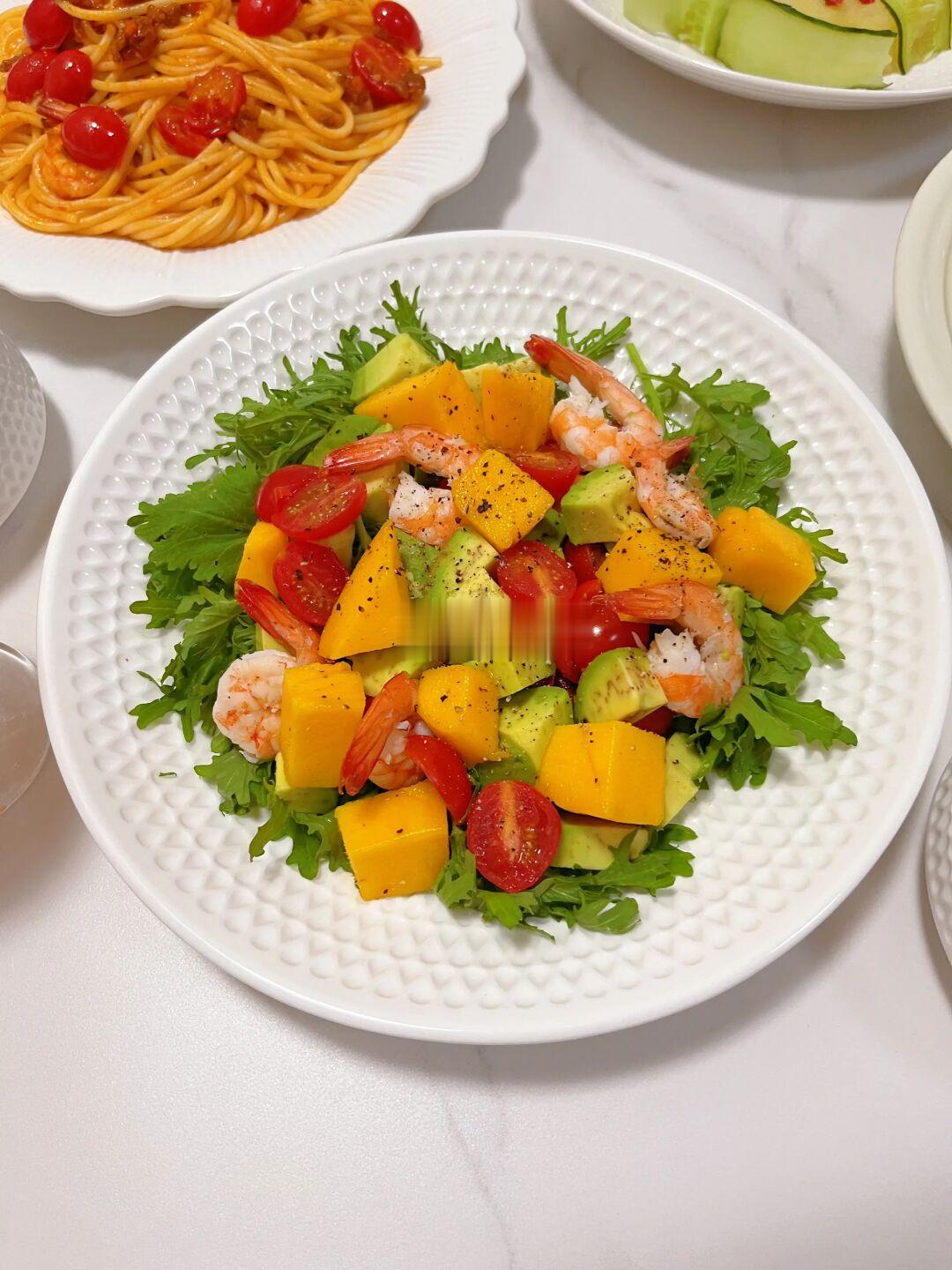 蔬菜清洗干净沥干水分,摆入盘中,入番茄芒果虾仁牛油果,入少许盐黑胡椒粉调味,挤少许柠檬汁即可