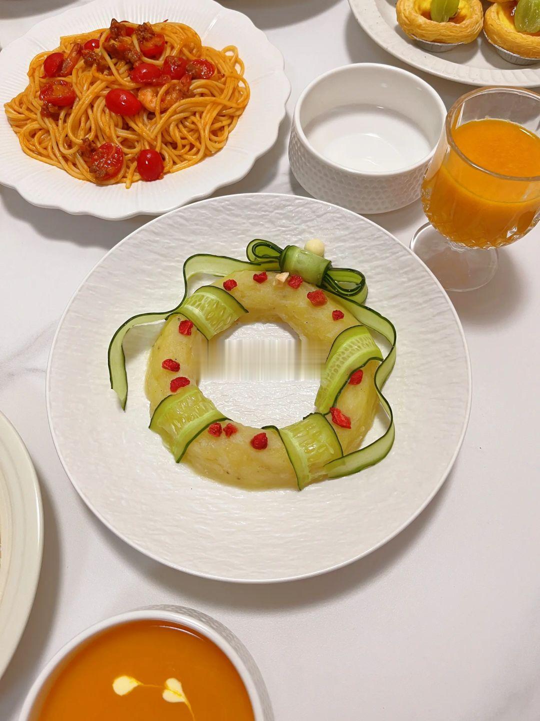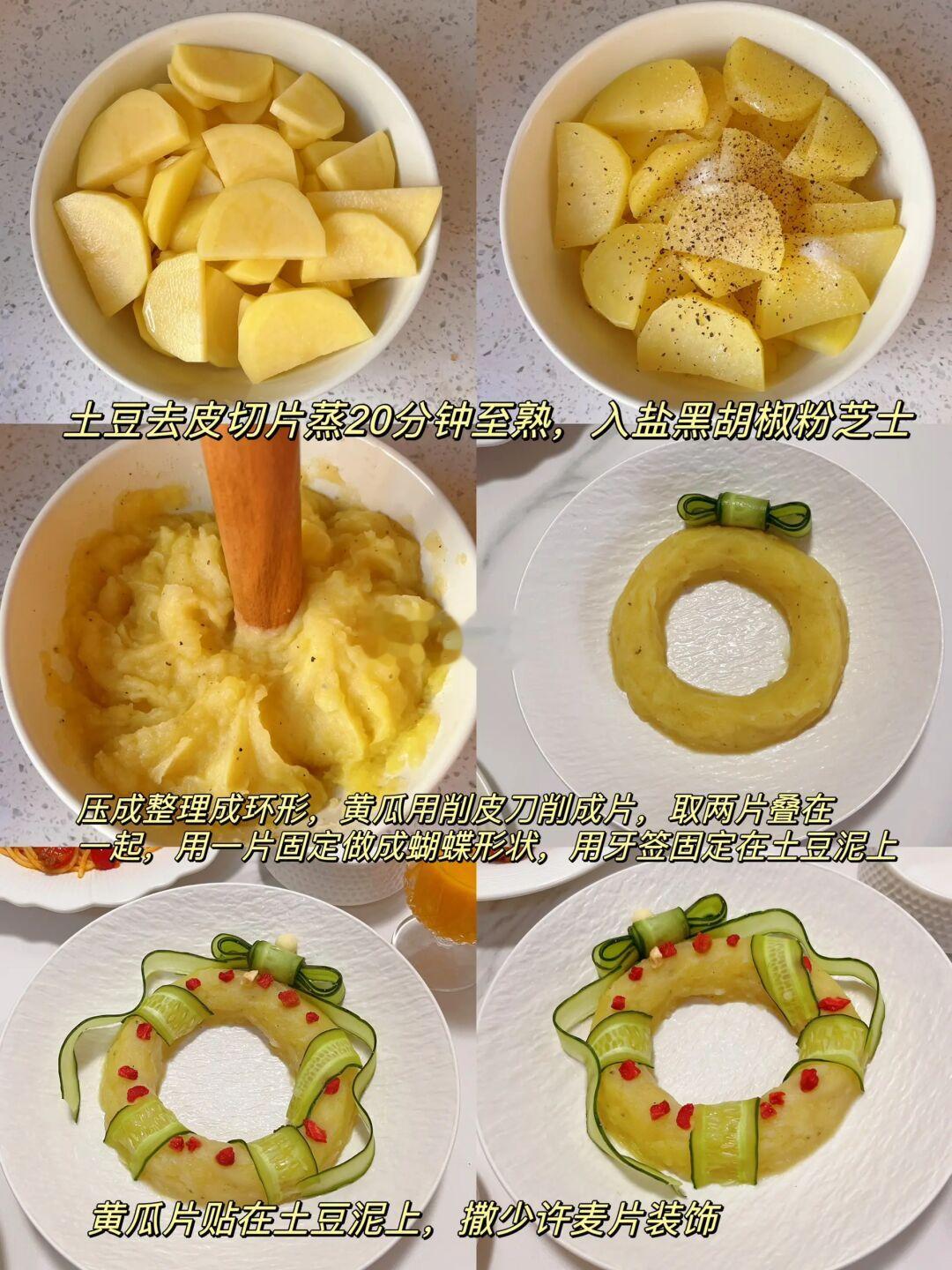 土豆去皮切片蒸20分钟至熟,入盐黑胡椒粉芝士压成泥,整理成环形,黄瓜用削皮刀削成片,取两片叠在一起,用一片固定做成蝴蝶形状,用牙签固定在土豆泥上,黄瓜片贴在土豆泥上,撒少许麦片装饰