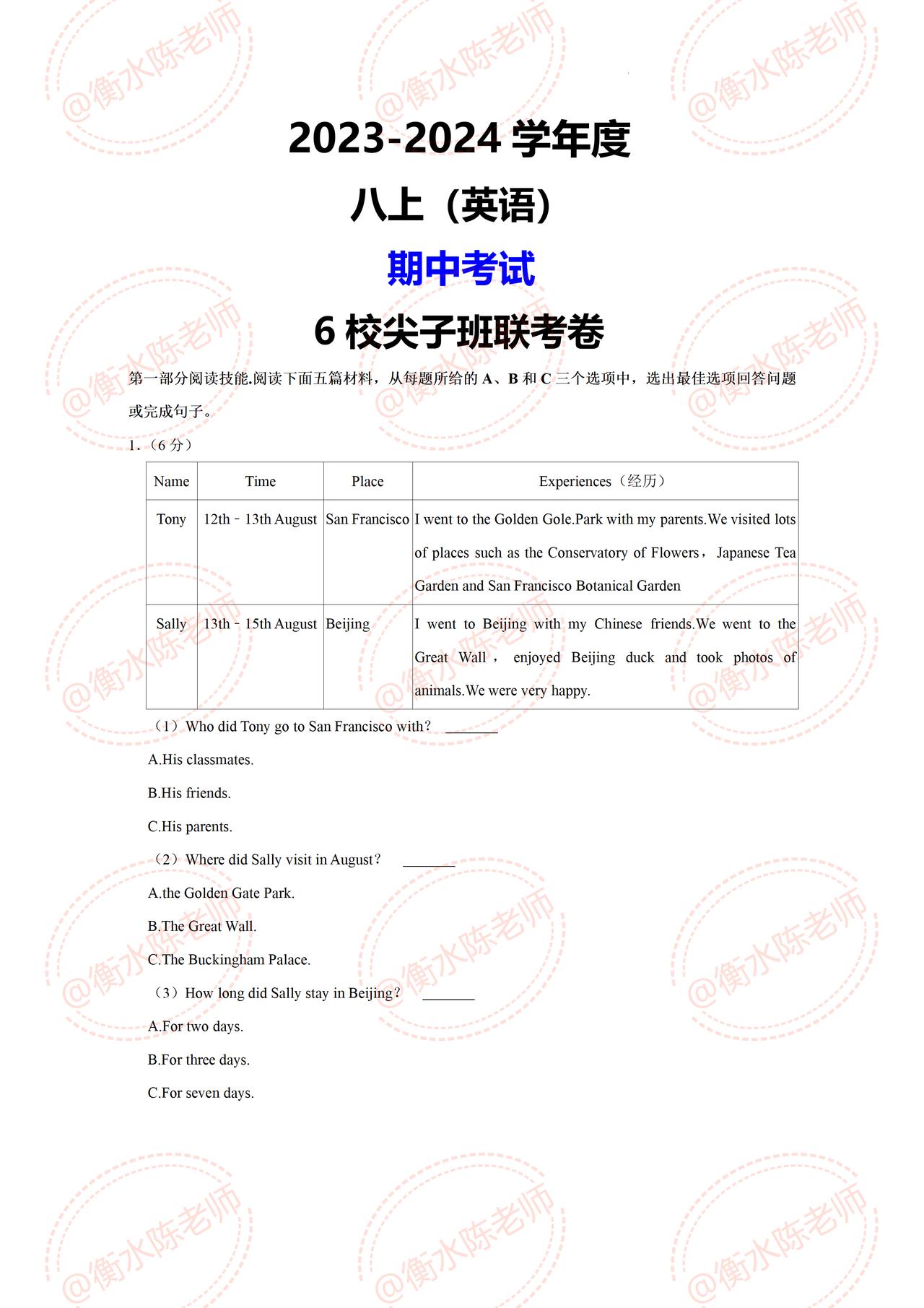八年级上册英语,期中考试6校重点班、实验班联考试卷,英语成绩不错,想要拔高的考生,期中考试之前,记得做一下根据自己城市、版本,学校考试重点编写的试卷,考试之前做一遍,让你少走很多弯路,多挣很多分数哦,难度有些大,慢慢做,想要获得自己城市对应期中试卷哦,赶紧找我沟通和联系哦。