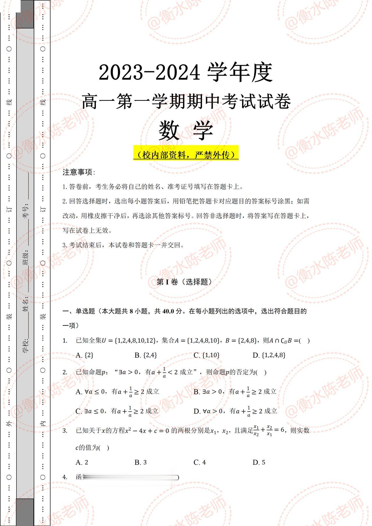 高中数学必修第一册,8校尖子班联考试卷,考试难度上有些大,名校名师编写的考题,数学成绩想要期中获得不错成绩,考试之前一定要做一遍自己城市,对应的期中试卷哦,当地对应的试卷,考题把握更加精准,让你多考分数,少走弯路哦,想要获取全部的考生,记得和我沟通联系哦。