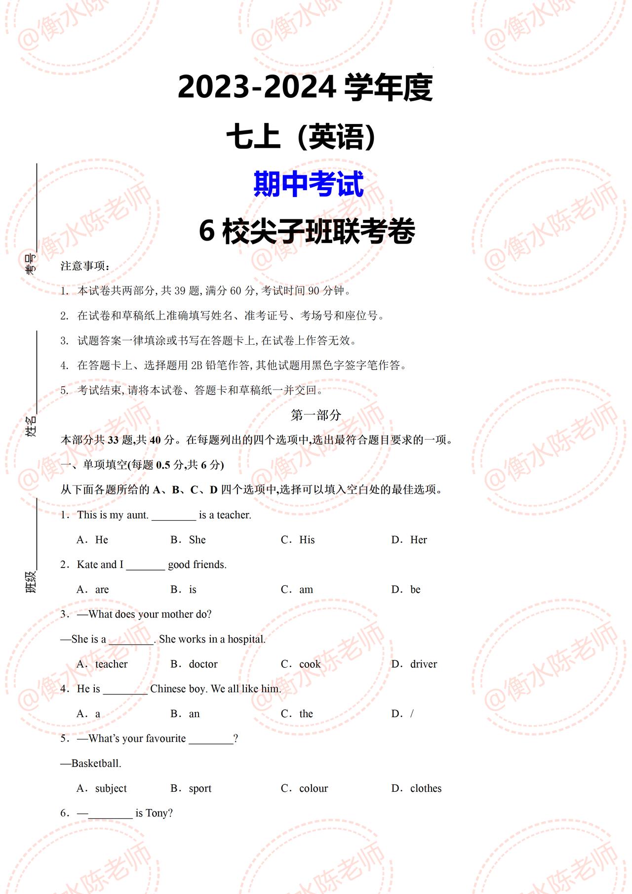 七年级上学期英语,6校尖子班期中联考试卷,考题难度稍微有些大哦,英语想要拔高一些的,提前练习一遍自己城市对应的期中试卷哦,期中卷是根据不同的城市、学校考试重点编写的,考题把握非常精准,月考成绩不太理想的,想要这次期中考出优异成绩,提前做完我们的试卷哦,让你考试中,少走很多弯路,多考分数哦。