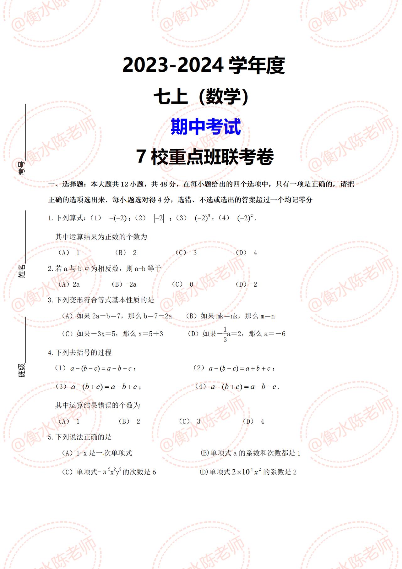 七年级上学期数学,第一学期【期中考试】7校重点班联考试卷,根据不同的城市、版本,考试重点编写的,月考成绩比较弱的,考试之前做一遍自己城市对应的期中卷哦,重点班联考试卷难度有些偏大,做的时候不要心急哦,想要考出好成绩,记得过来找我,拿对应期中试卷哦。