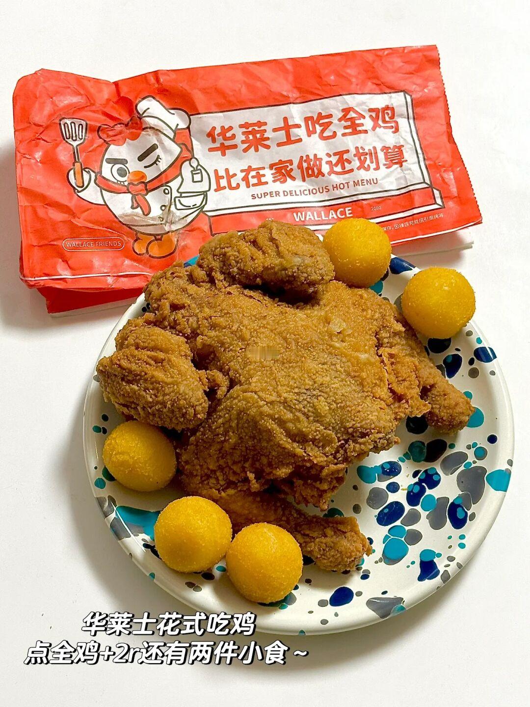 炸全鸡:我是买滴华莱士的花式吃全鸡套餐,加2块还可以得到两件小食!很划算!炸鸡是现炸出来的,里面的肉肉汁满满,外壳香香脆脆好吃晕了~