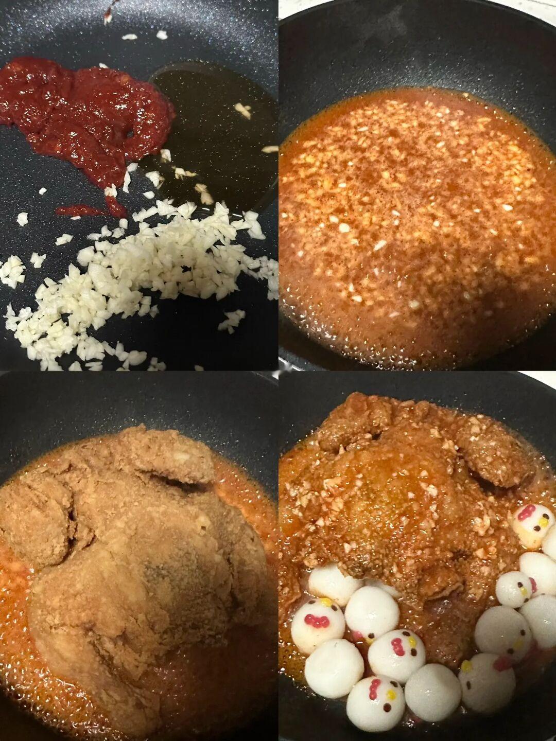 3.酱汁配料混合在锅中炒香后加入水,煮至冒泡后放入炸鸡和年糕裹上酱汁