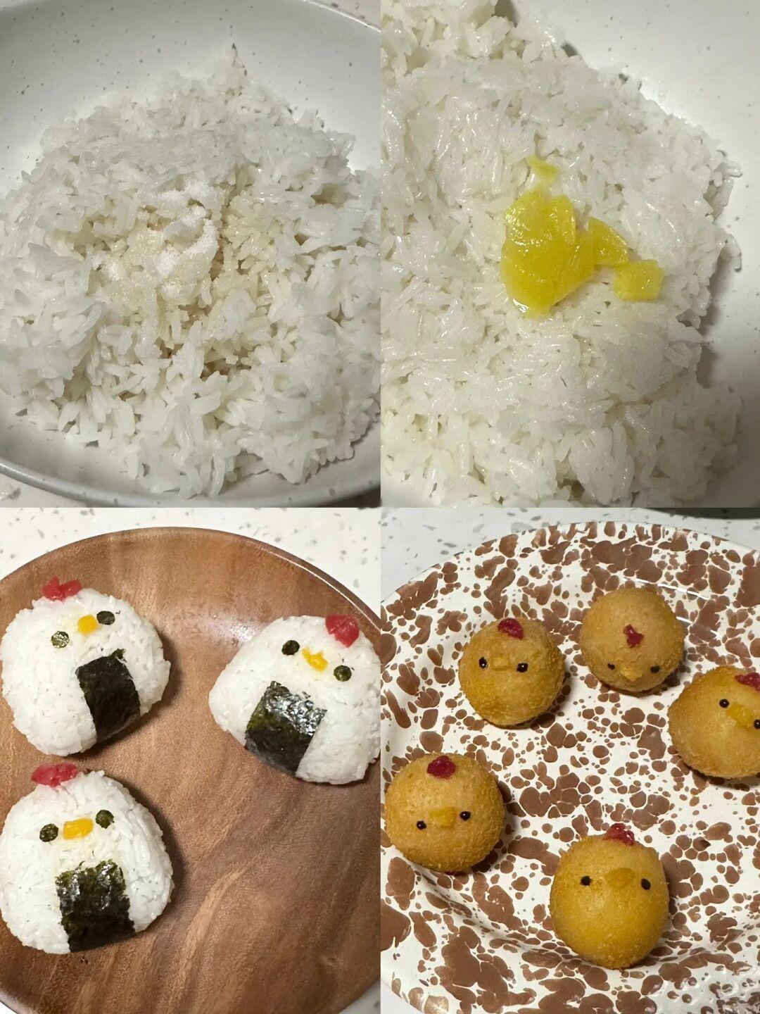 2.米饭拌入调料后包入泡菜捏成饭团再装饰一下(鸡冠和鸡嘴是年糕,眼睛是海苔)