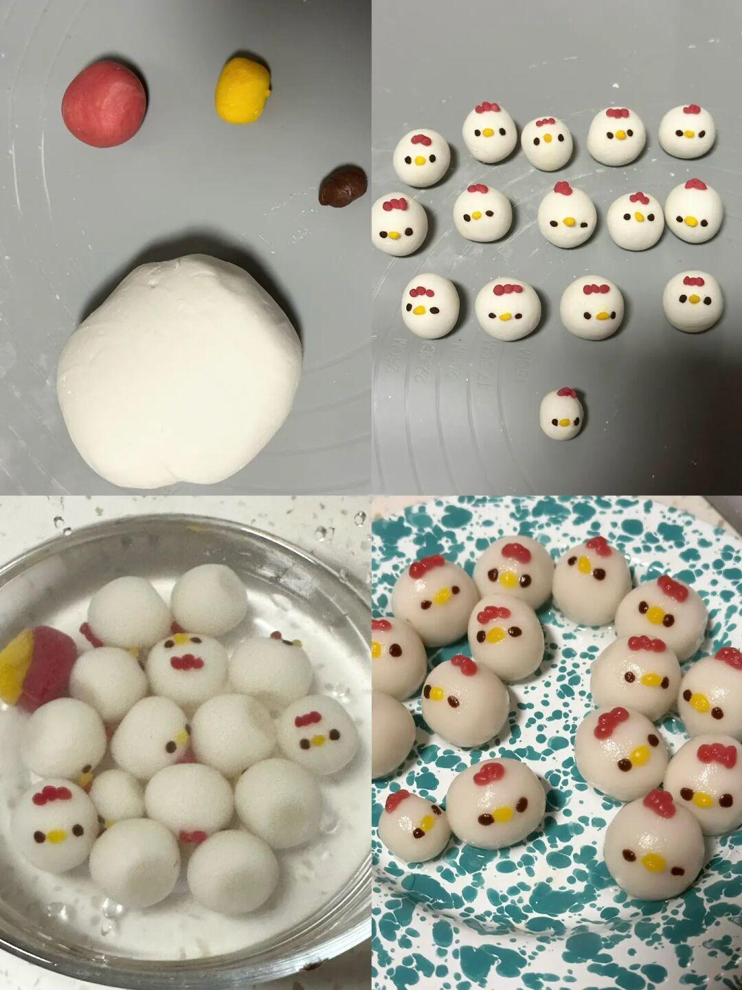 1.年糕配料混合均匀,分份调色后捏成小鸡,蒸10分钟过凉水备用
