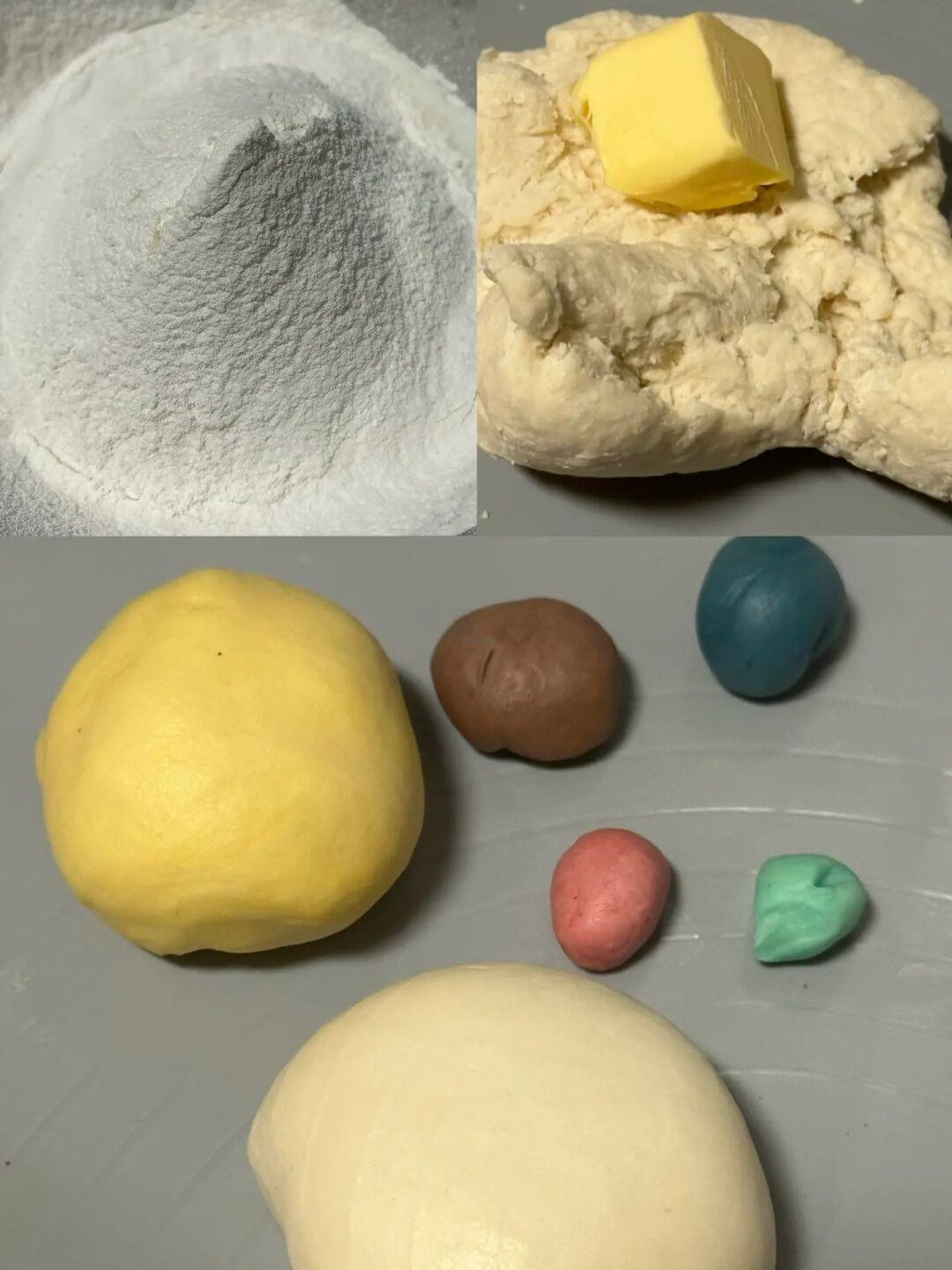 1.面包体配料除黄油以外混合成团,再加入黄油揉光滑,分份调色(120g白色、120g黄色、其他随便)