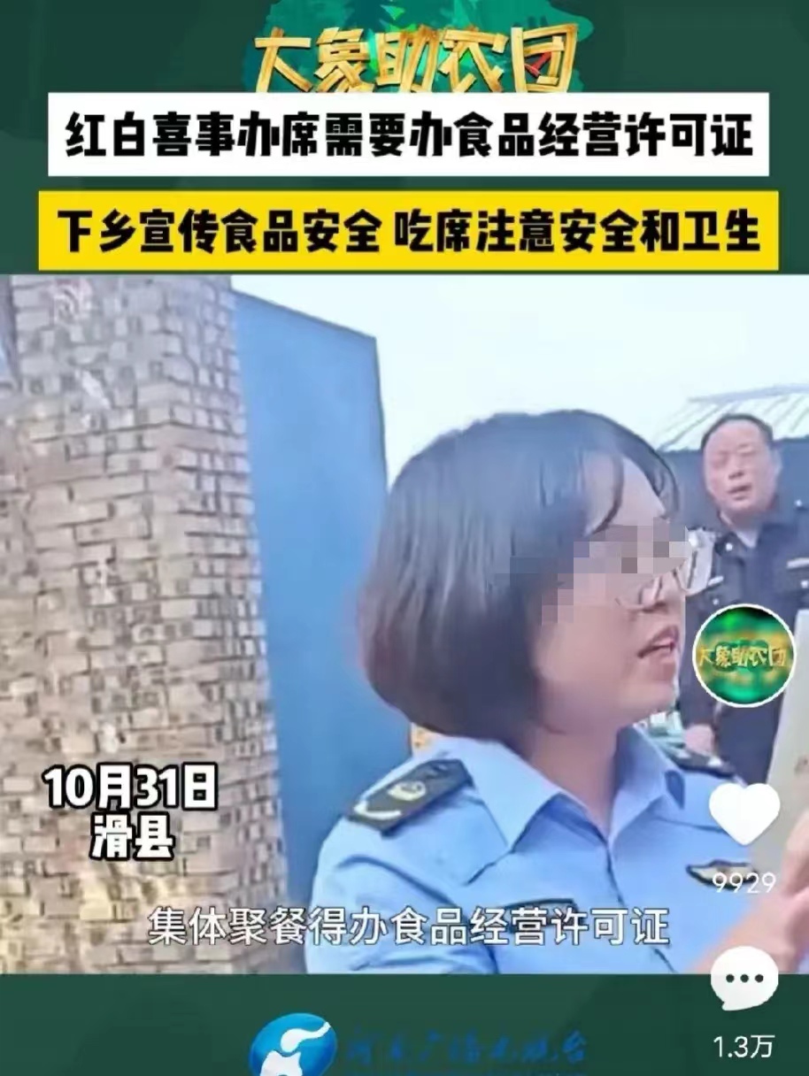 挺滑稽的一件事,是不是只有在河南才出现?在农村办红白喜事,必须提前办好食品经营许可证,来保证食品的安全和卫生。关键点来了,假如没有办证的话怎么办?穿制服的人员毫不犹豫的回答:就得罚款。