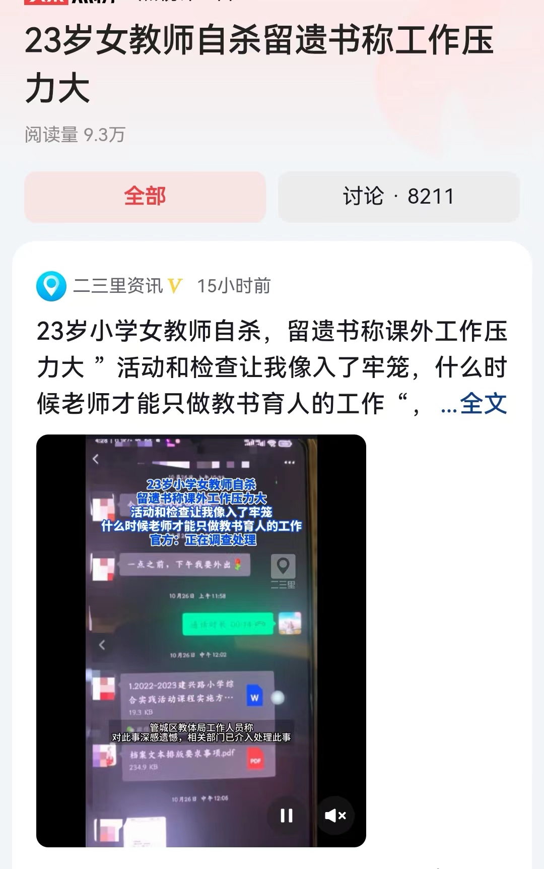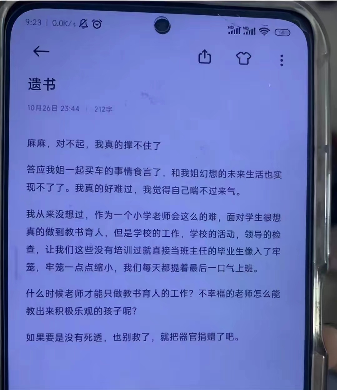 #23岁女教师自杀留遗书称工作压力大#现在这世界怎么了?时不时听到学生要自杀,现在又出现小学老师自杀,现在社会的压力真的这么大吗?希望河南郑州这位小学班主任女老师,可以在另外一个世界过得更好。过得很轻松或者没有压力,让他感觉自由自在,希望他的家属节哀。