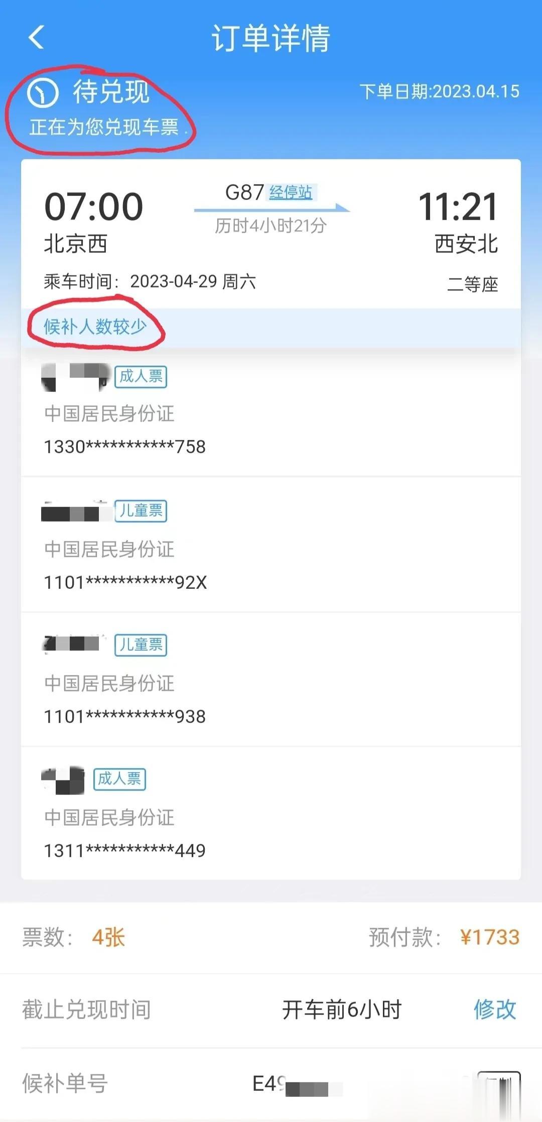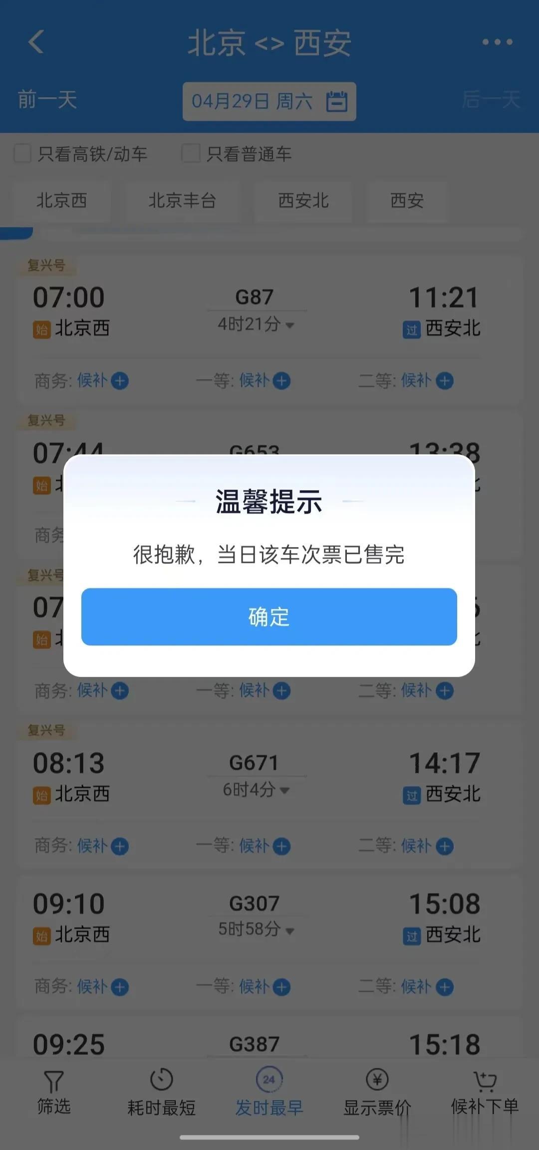大家五一去哪玩儿?买到票了吗? 五一计划带娃去西安旅游,攻略做了一大堆,纪录片也看了,相应的书也准备了,景区的门票和酒店也都预订了,万事俱备只欠一张车票了。于是算计好放票的时间,定好闹钟,我和娃爸两个人,火力全开,心想怎么样也能抢到票了吧。结果很尴尬,前一秒显示暂未开售,下一秒直接被发配候补。然后一直显示“候补人数较少”,却始终补不上,大家有没有遇到过这种情况啊?我们还有希望拿到票吗?辛辛苦苦地准备了这么多,难道真的要被一张车票劝退吗?